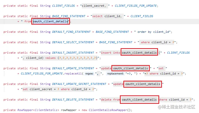 我们使用 JdbcClientDetailsService 来操作数据库管理token,但是从这个类的源码可知,所有语句都是对 oauth_client_details 这张表的操作,所以表明不是由着我们随意的。