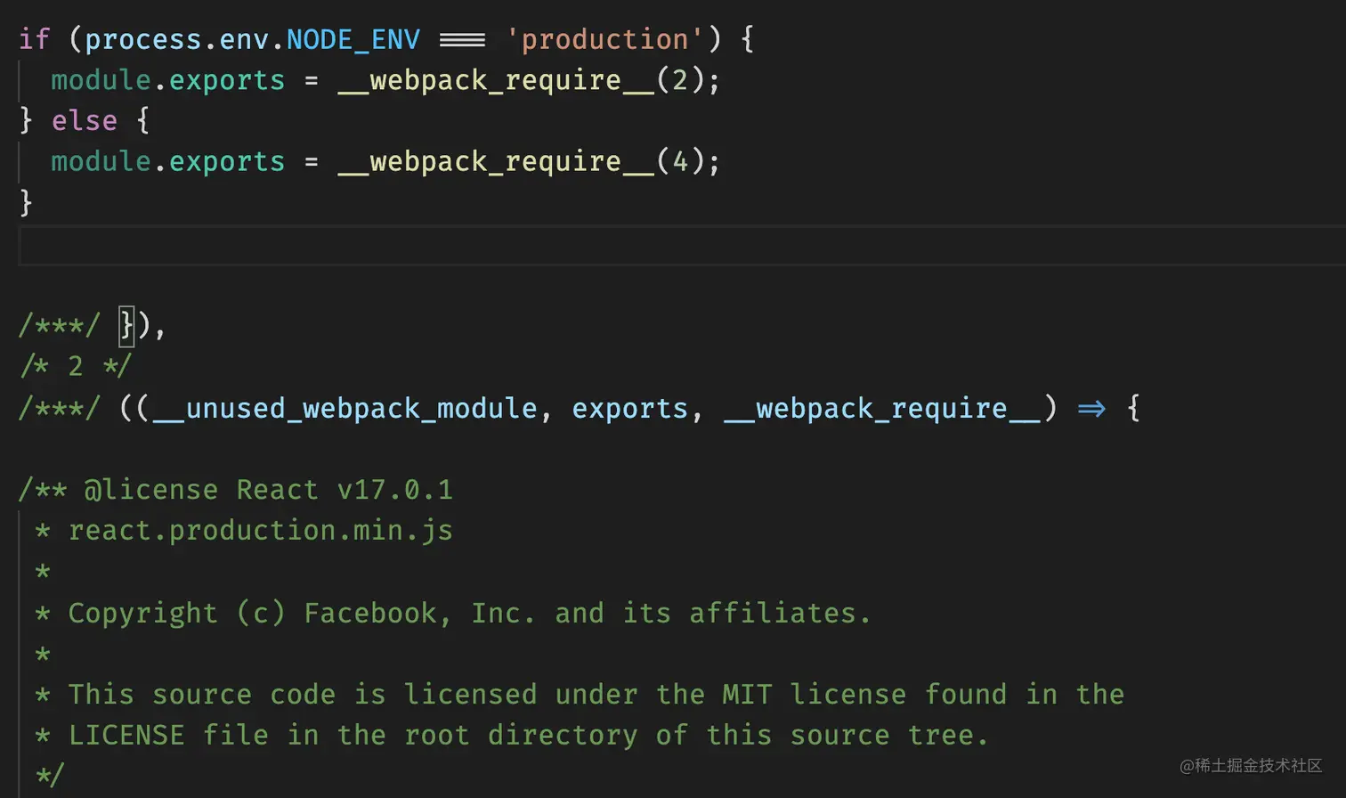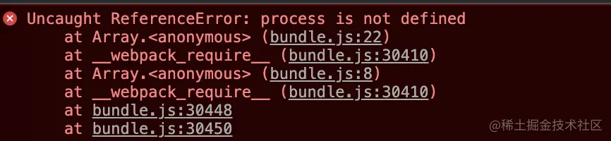 我们分析一下打包后的代码,可以看到会根据环境变量的配置来判断引入是引入开发版本的react还是生产版本的react,此时process变量没有被定义。