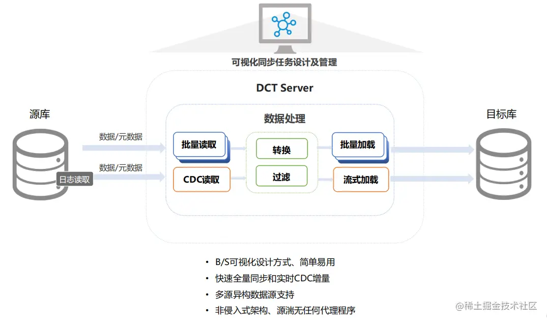 滴普数据集成平台DCT 的数据实时同步功能基于数据库日志CDC的数据交换,利用了数据库日志本身的服务性能,保证了交换性能,非侵入性,在源和目标端不安装任何代理程序对源库性能影响小(<3%);数据实时同步适用于异地多活、实时数仓、实时BI分析、实时计算引擎flink等场景。