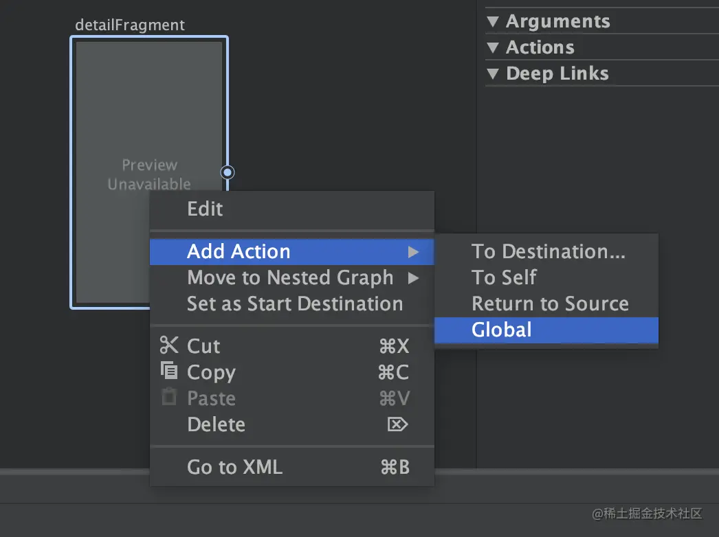 在navigation的xml中,添加具体fragment,右键Add Action选择Global