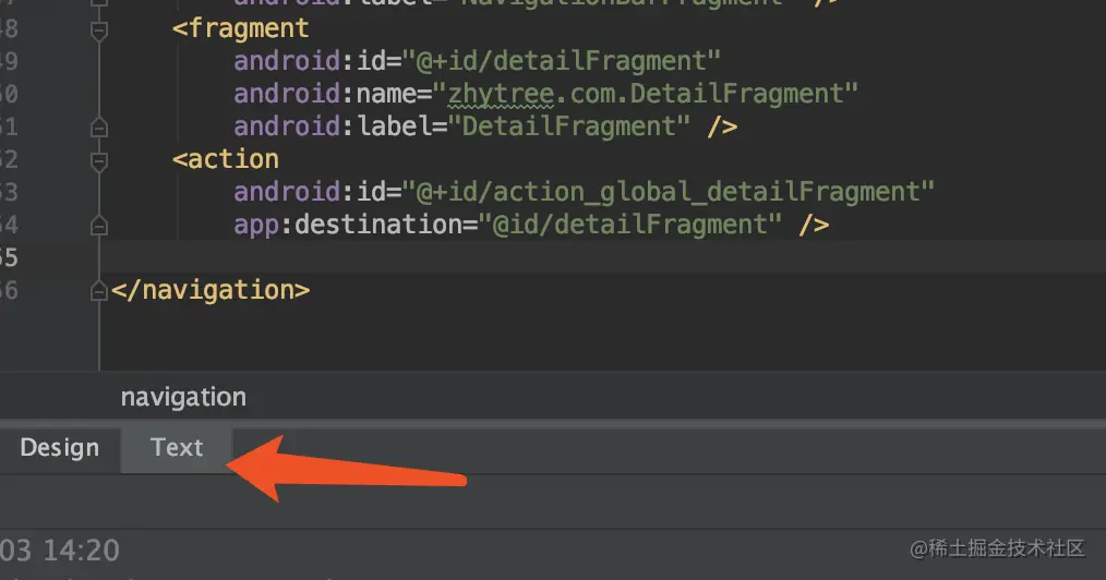 可以看到系统为我们生成了一个action,并指向刚刚添加的fragment。然后在你想跳转的地方使用这个action就可以了。