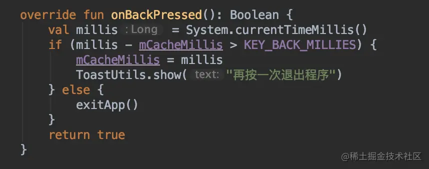 问题三:退出应用的Back事件处理;也比较好处理。首先我们来到我们第一层Fragment,也就是Activity最接近的Activity,我这里命名的是“MainFragment”,然后在这里重写我们上一步在BaseFragment中定义的拦截返回的方法,并返回true