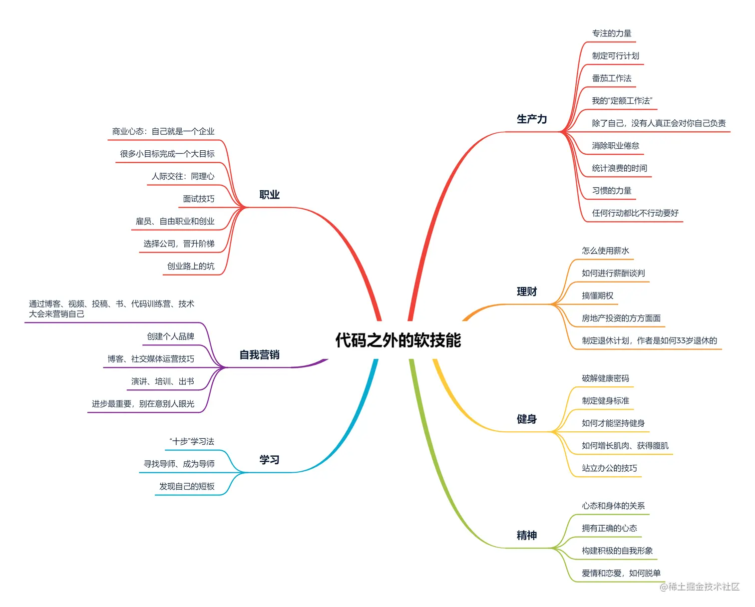 虽然本书说的是“程序员必备的软技能”,但我认为这是所有职业都通用的软技能。该书中总共分成七个部分,分别是:职业、自我营销、学习、生产力、理财、健身、精神。我做了下面的思维导图,可以概括个大概,可以根据需要随意读取某个章节: