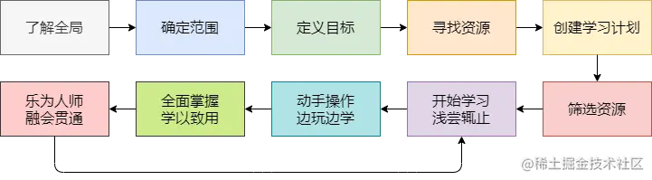第一步到第六步:学习前的准备部分,即为前期调研以及设定目标。