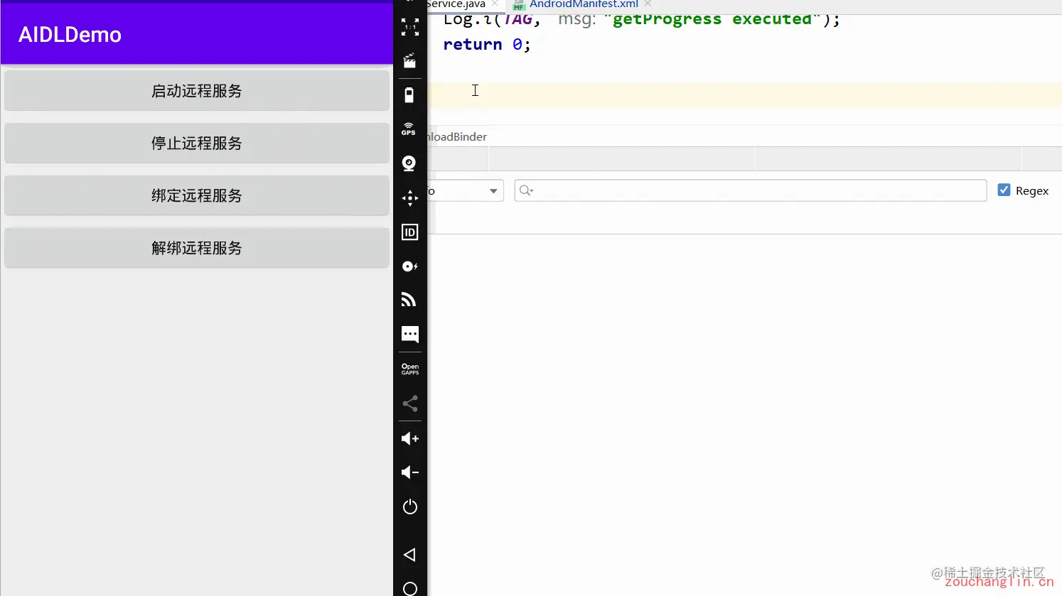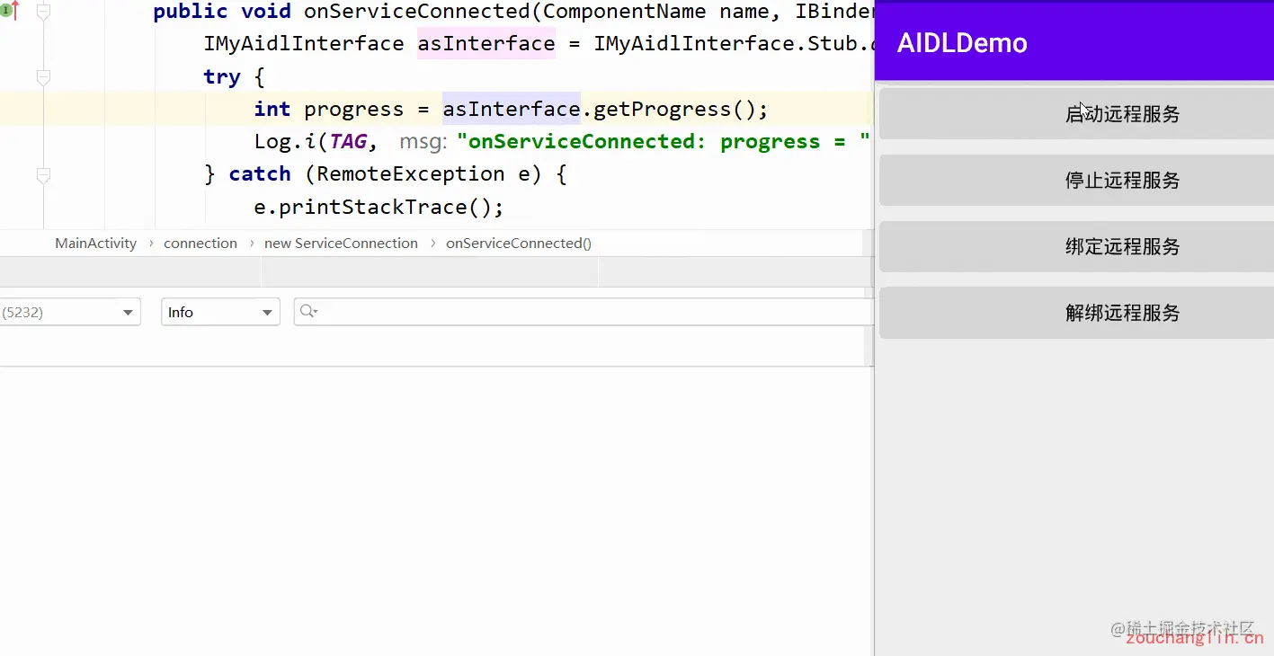 可以看到,AIDLDemo 这个 App 的 MainActivity 已经和 BasicService 这个 App 的 MyService 服务已经绑定了,并且可以正常的调用 MyService 中的方法。至此,通过 AIDL 实现的远程绑定服务通信已经完成了: