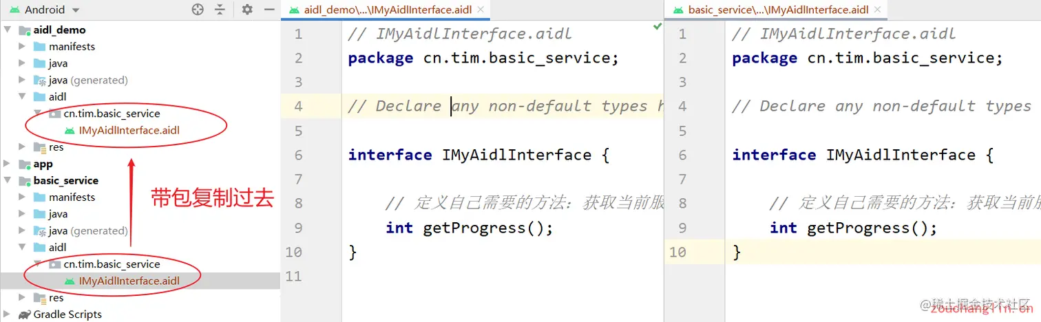 step4、复制同样的 AIDL 文件到 AIDLDemo 这个工程中,AIDL 作为调用者。需要注意的是必须放到相同的包下,因此需要手动建包,再把文件复制过来:
