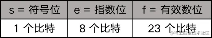 IEEE-754 标准中定义了计算机如何用 32 个比特位存储一个浮点数:从左边起,第 1 位是符号位,用 s 表示,s=0 表示正数,s=1 表示负数;第 2 位到第 9 位是指数位,用 e 表示;第 10 位到第 32 位是有效数位,用 f 表示。知道了s、e、f,根据下面的公式,就可以算出浮点数的值: