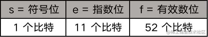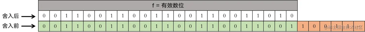 上面这张图展示了 0.3 的有效数位,上面那行(即白色背景)数字是实际存储在计算机中的,也就是舍入后的,下面那行(绿色背景 + 橙色背景)是舍入前的,其中橙色背景的是需要舍入的部分。默认的舍入规则是舍入到最接近,一样接近的情况下偶数优先。比如上面那张图中,直接舍掉的话结果是 00110011001100110011001,与直接舍掉相比,舍入前的数字显然更接近 00110011001100110011010(不要忘了我们讨论的只是小数部分,前面还有一个默认的「1.」),所以我们最终得到的有效数位 f 就是 00110011001100110011010。
