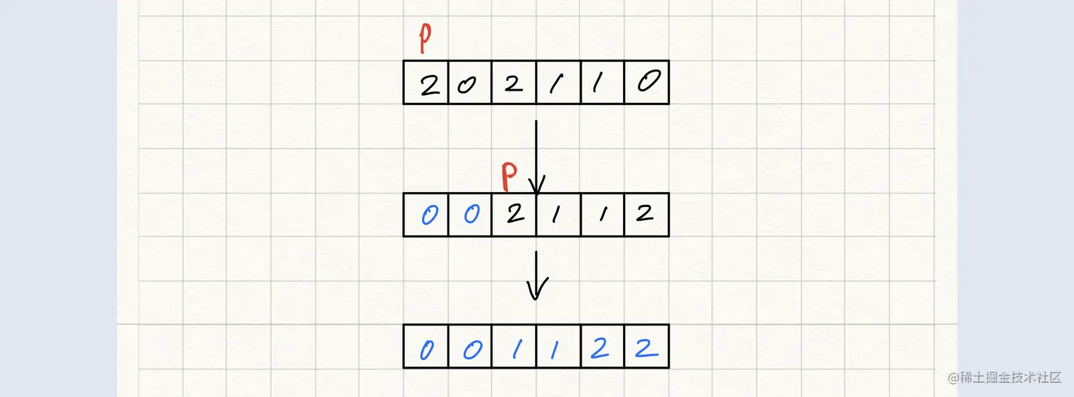 - i从左往右扫,指针p0是下一个放0的位置,指针p1是下一个放1的位置。
