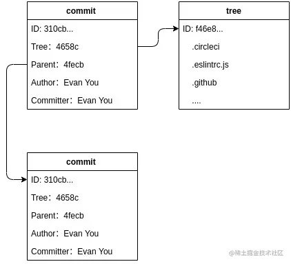 下图清楚地显示了命令git log -1 --pretty=raw命令输出结果中各个对象的关系。