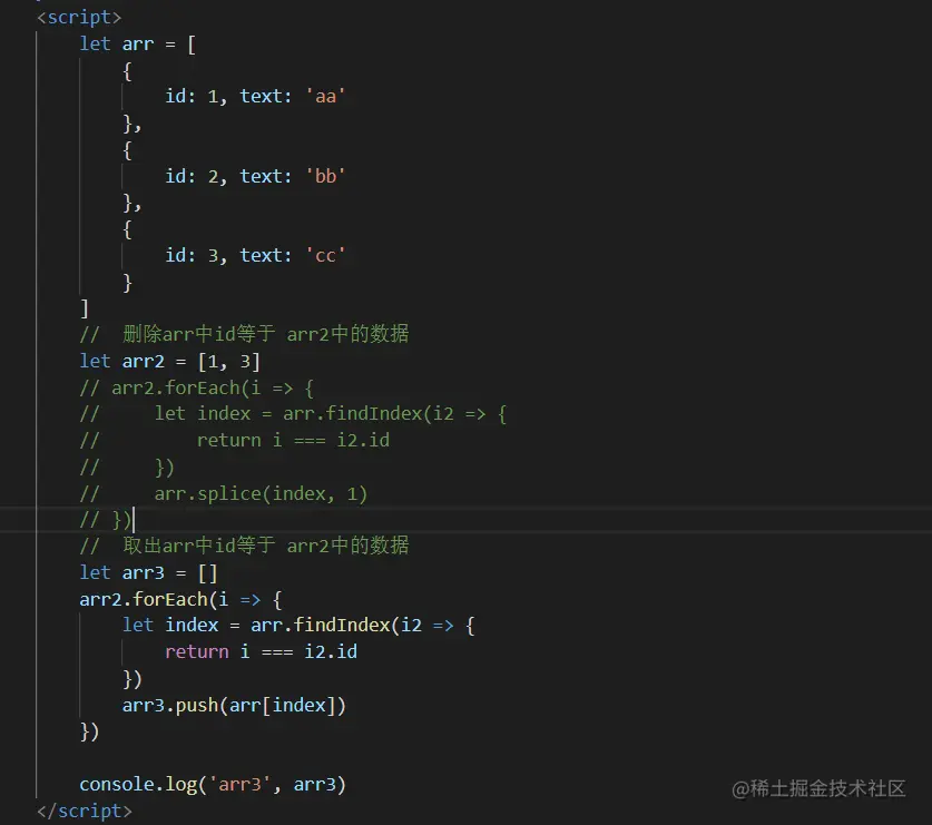 <script> let arr = [ { id: 1, text: 'aa' }, { id: 2, text: 'bb' }, { id: 3, text: 'cc' } ] // 删除arr中id等于 arr2中的数据 let arr2 = [1, 3] // arr2.forEach(i => { // let index = arr.findIndex(i2 => { // return i === i2.id // }) // arr.splice(index, 1) // }) // 取出arr中id等于 arr2中的数据 let arr3 = [] arr2.forEach(i => { let index = arr.findIndex(i2 => { return i === i2.id }) arr3.push(arr[index]) }) console.log('arr3', arr3) </script>