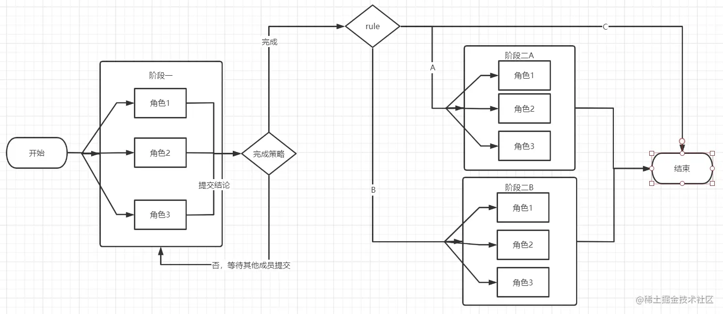 - 每个阶段都可能存在多个成员审批,并且制定完成策略,如一个人提交跳转,所有人均提交,才算完成;
