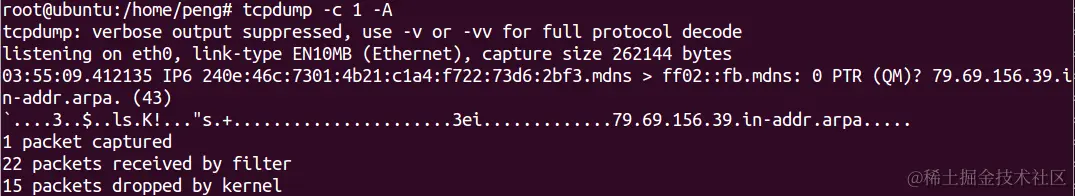 按下Ctrl+C会终止tcpdump命令。且会在结尾处生成统计信息。