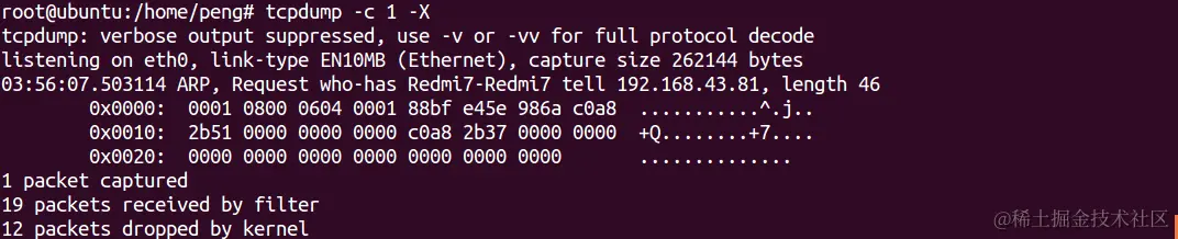 使用-X参数能16进制数与ASCII码共同显示数据包。