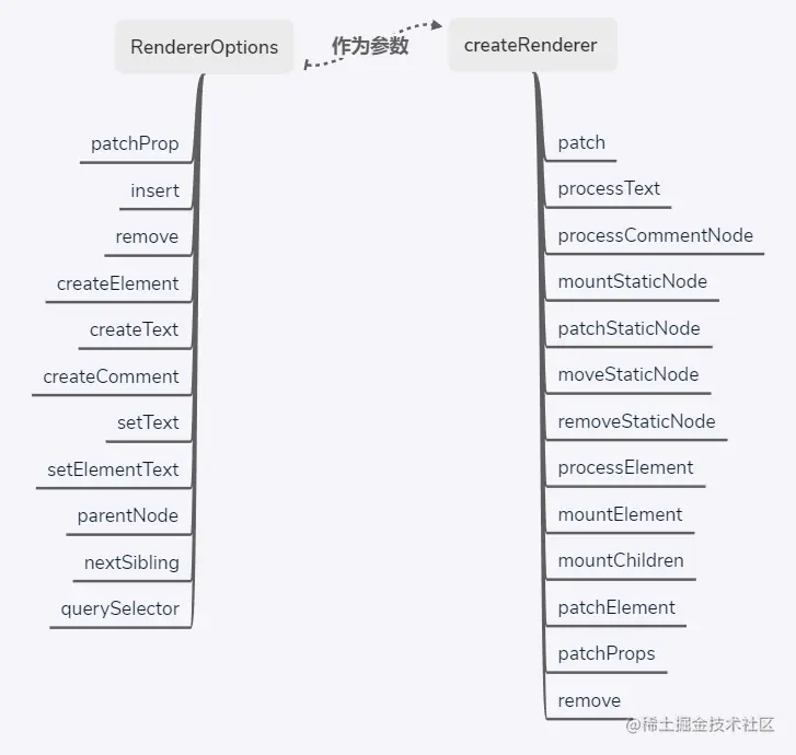 RendererOptions是一个对象,定义了对元素/属性的增删改查功能,其作为参数传递给createRenderer(准确的说是baseCreateRenderer),根据传递的方法不同,来满足用户对于自定义元素和属性处理方式的要求