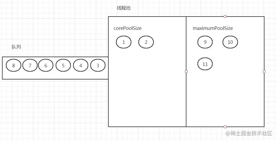 1.先判断线程池中的线程是否大于corePoolSize,若是则放入线程池。