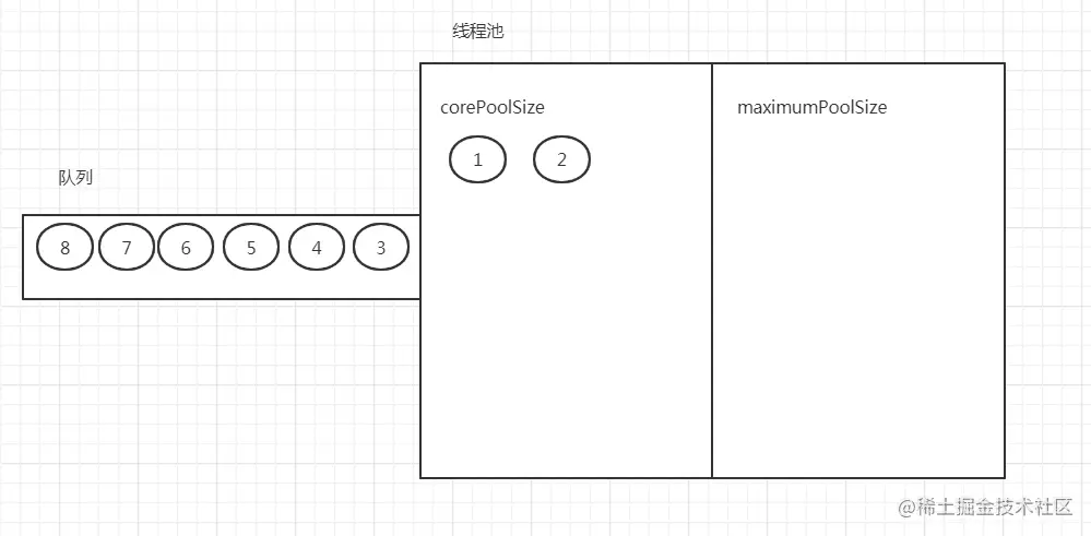 2.若线程池中的线程大于corePoolSize,则放入队列中。