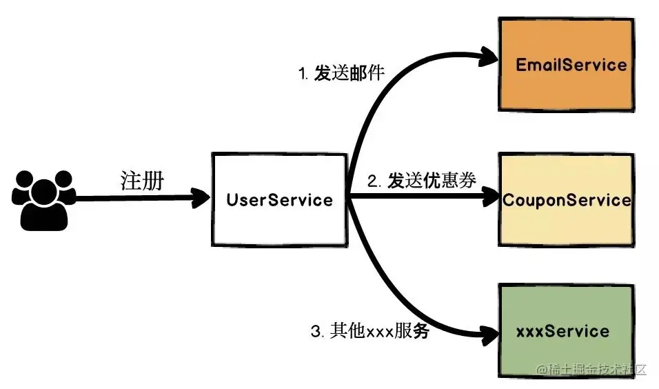 观察者模式定义对象间的一种一对多的依赖关系,当一个对象的状态发生改变时,所有依赖于它的对象都得到通知并被自动更新,其主要解决一个对象状态改变给其他关联对象通知的问题,保证易用和低耦合。一个典型的应用场景是:当用户注册以后,需要给用户发送邮件,发送优惠券等操作,如下图所示。