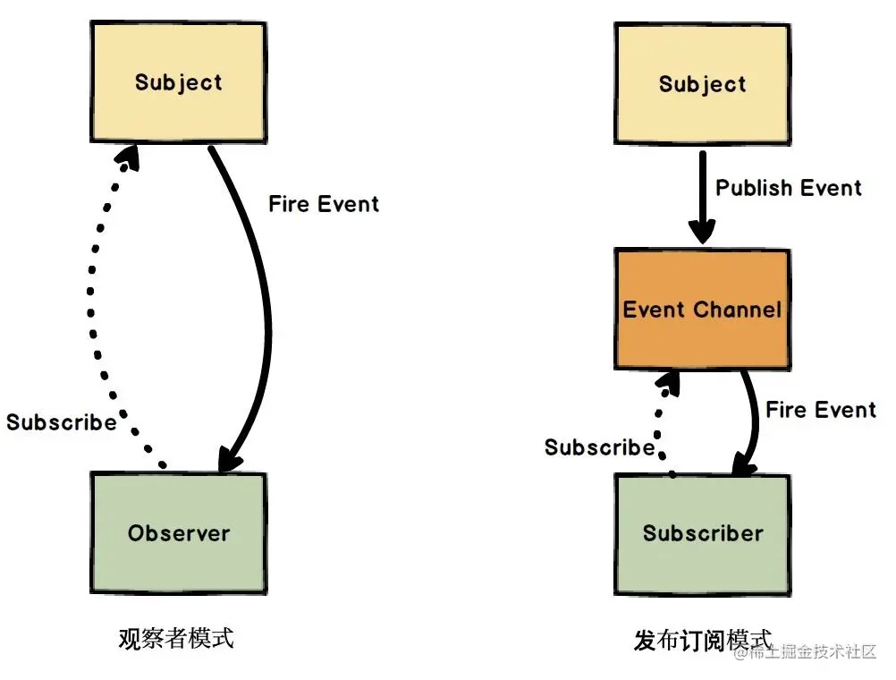 看到这里,细心的同学可能想到了发布订阅模式,其实观察者模式于发布订阅还是有区别的,简单来说,发布订阅模式属于广义上的观察者模式,在观察者模式的 Subject 和 Observer 的基础上,引入 Event Channel 这个中介,进一步解耦。图示如下,可以看出,观察者模式更加轻量,通常用于单机,而发布订阅模式相对而言更重一些,通常用于分布式环境下的消息通知场景。