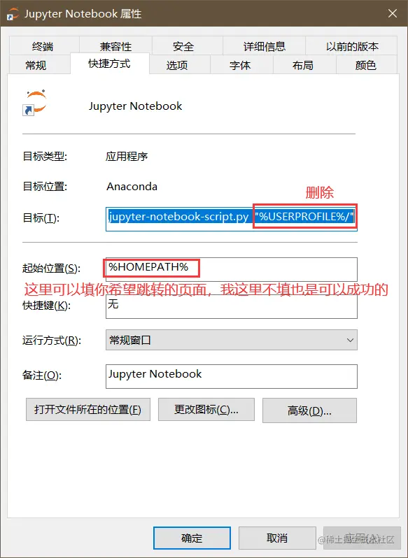 - 找到Jupter Notebook的快捷方式,打开它的属性然后进行以下截图的操作即可