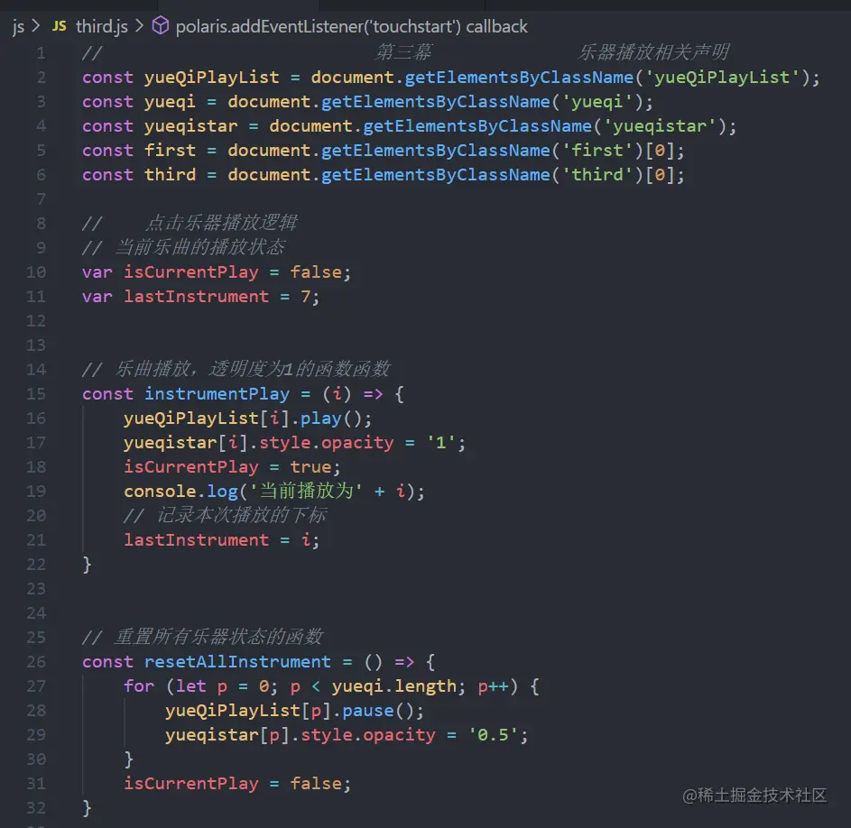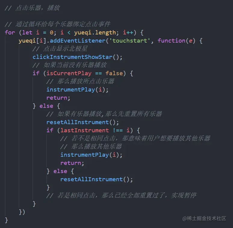 及再次点击实现乐曲暂停,图片变化由黄变白(使用了数组的循环遍历,注意对下标的使用)