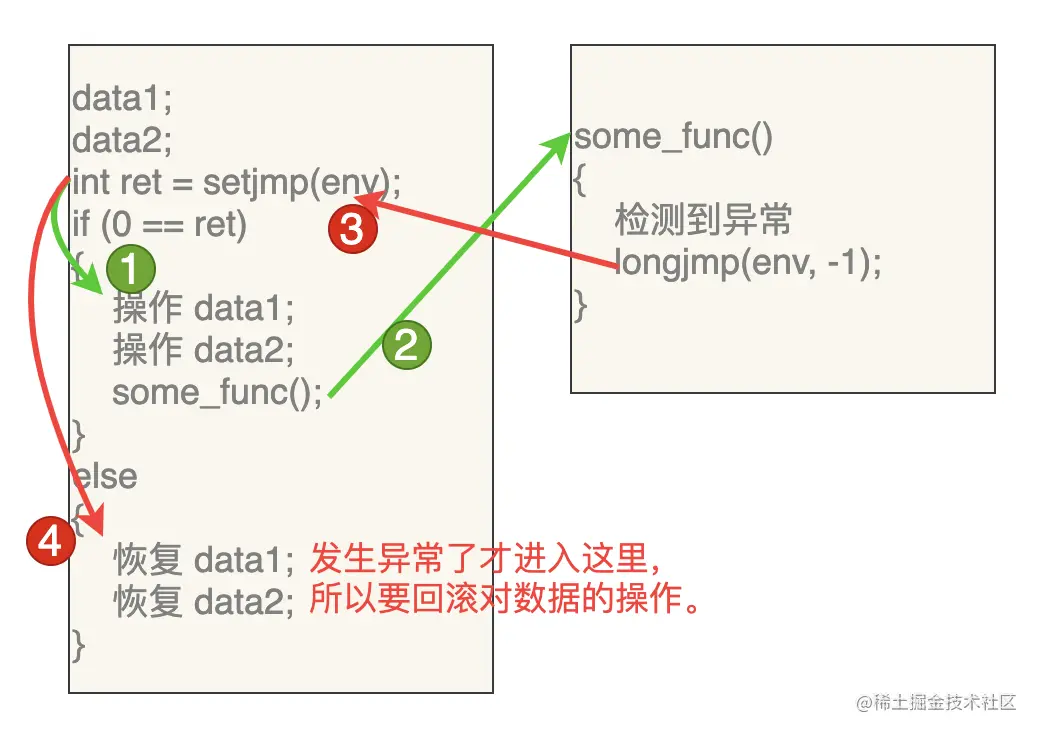有一点需要注意:setjmp/longjmp 仅仅是改变了程序的执行顺序,应用程序自己的一些数据如果需要回滚的话,需要我们自己手动处理。