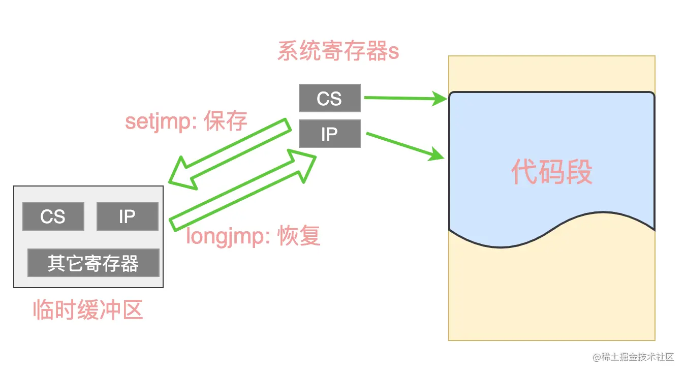 我们可以简单的把这些寄存器信息理解为上下文信息,CPU 就根据这些上下文信息来执行。因此,C 语言为我们准备了 setjmp 这个库函数来把当前的上下文信息保存起来,暂时存储到一个缓冲区中。