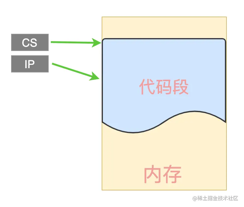 CPU 在获取下一条执行指令时,通过 CS 和 IP 这 2 个寄存器就能获取到需要执行的指令,如下图: