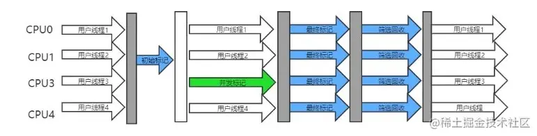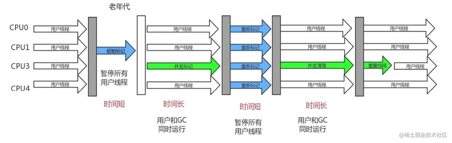 区别最大的是,最终标记后,需要再次筛选回收,主要是为了追求停顿时间,减少卡顿。