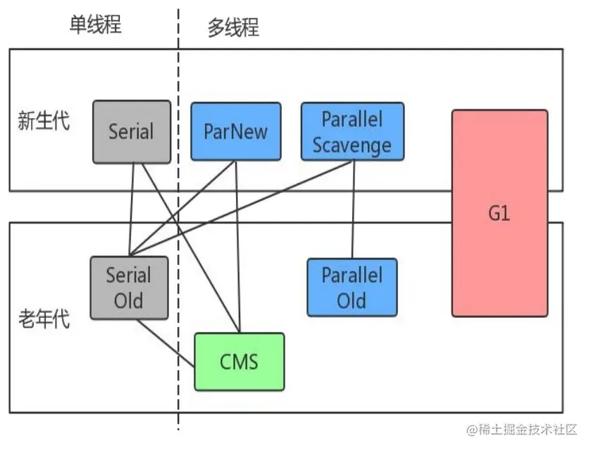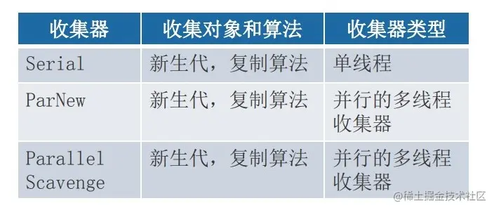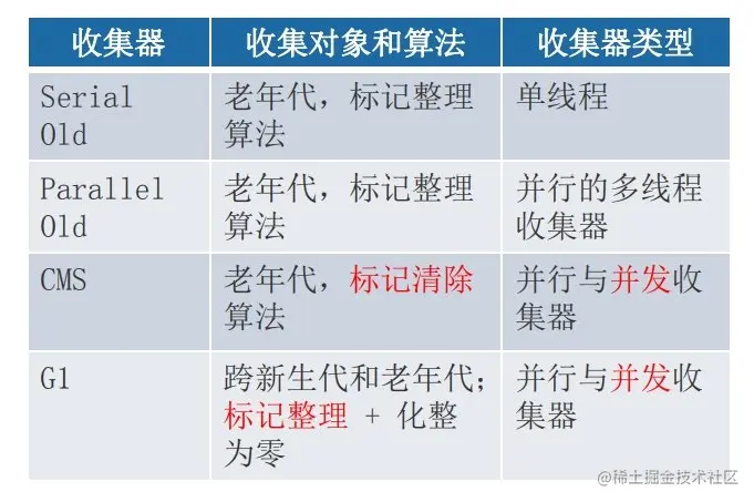 对比多线程的Parallel Scavenge 、Parallel Old和 Serial 、Serial Old,算法都一样,差别主要在于前者是并行的垃圾收集器,回收效率高。