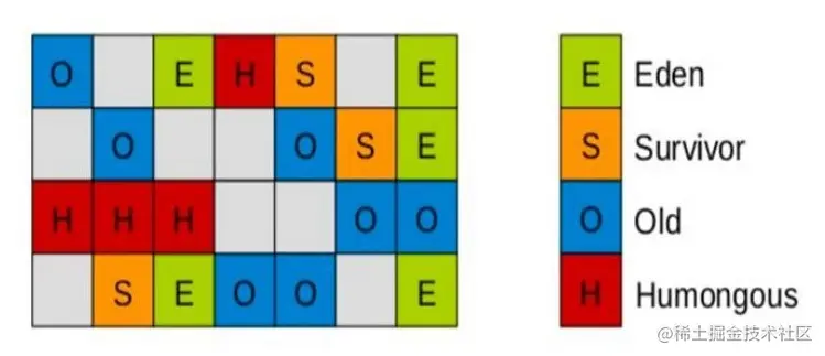 内存布局也不一样了,减少了一个复制对象的过程,例如下面每个框框内,可能可以回收80%,60%等。分配大对象时,超过了一个框框所占的内存大小,通过分配连续的H空间。