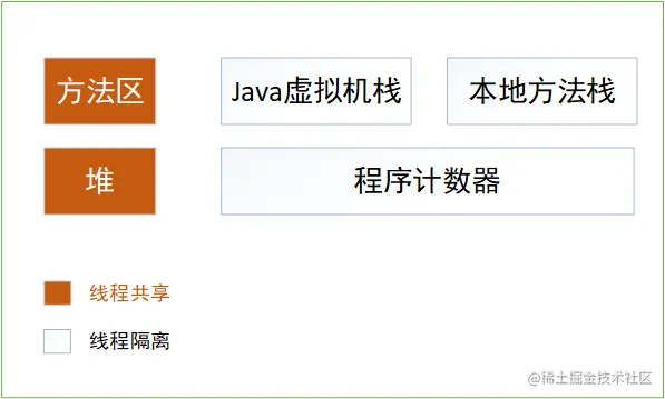 线程共享的只有方法区和堆,其它是线程私有的,方法的调用对应着栈帧的出栈和入栈,无论方法正常完成还是异常完成都算作方法结束。