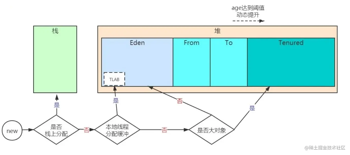 几乎所有对象实例 (经过逃逸分析的不会) 都在堆上分配、数组
