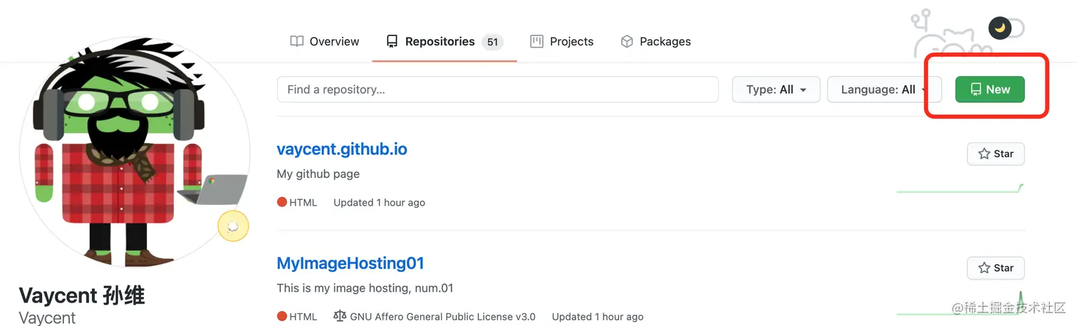 我的这个图床仓库名是Vaycent/MyImageHosting01