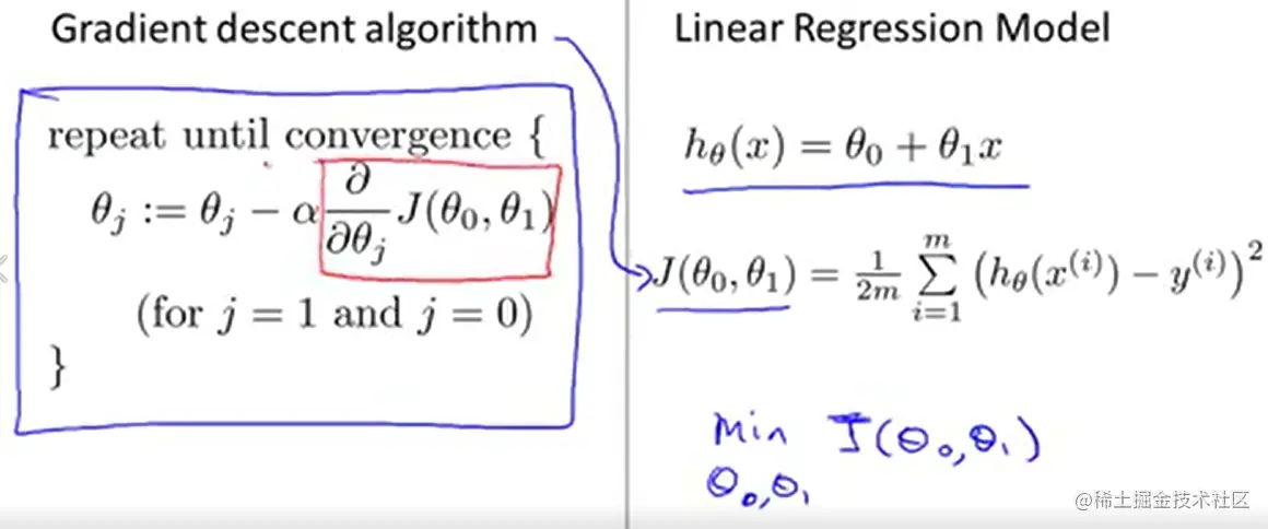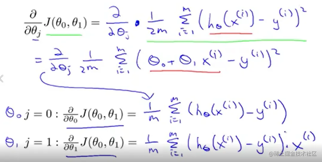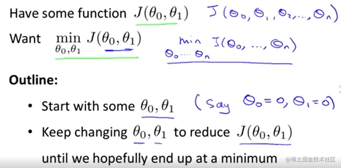 如何确定θ0,θ1关键在于如何衡量hθ(xi)与yi之间的差别,我们用均方误差来表示这种差别,最终优化的目标是找到使均方误差最小的θ0,θ1的值。在此例中,均方误差也被称为 cost function。