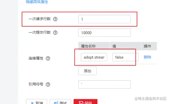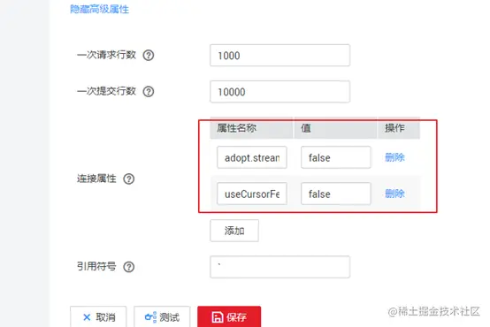 新建Mysql连接器,建立方法详见官网,在高级属性中增加useCursorFetch=false和adopt.stream=false