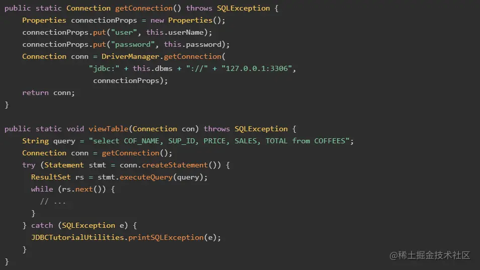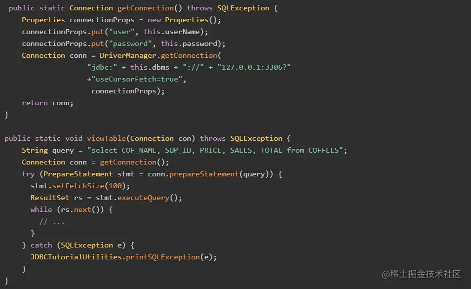 参考 JDBC API docs,网上很多教程需要设置useCursorFetch=trueResultSet.FETCH_REVERSE等,其实小编研究完JDBC驱动源码后发现,只需要设fetchSize=Integer. MIN_VALUE,其他配置均和默认配置保持一致即可。游标模式 Java demo 代码如下