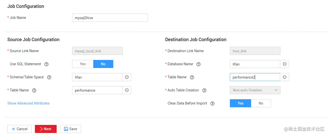 新建Mysql2Hive的CDM迁移作业,源表101个字段,100万行数据,配置如下