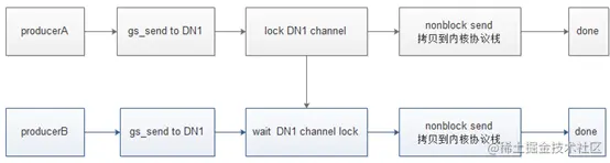 TCP代理通信库的发送端实现,producerA和producerB分别给DN1发送数据,为保证发送端head+data发送的完整性,producerA首先需要对单个物理连加锁,此时producerB处于等锁状态,producerA将数据完整发送到本地协议栈后返回,并释放锁,producerB获得锁后发送数据。节点数越多冲突越少。