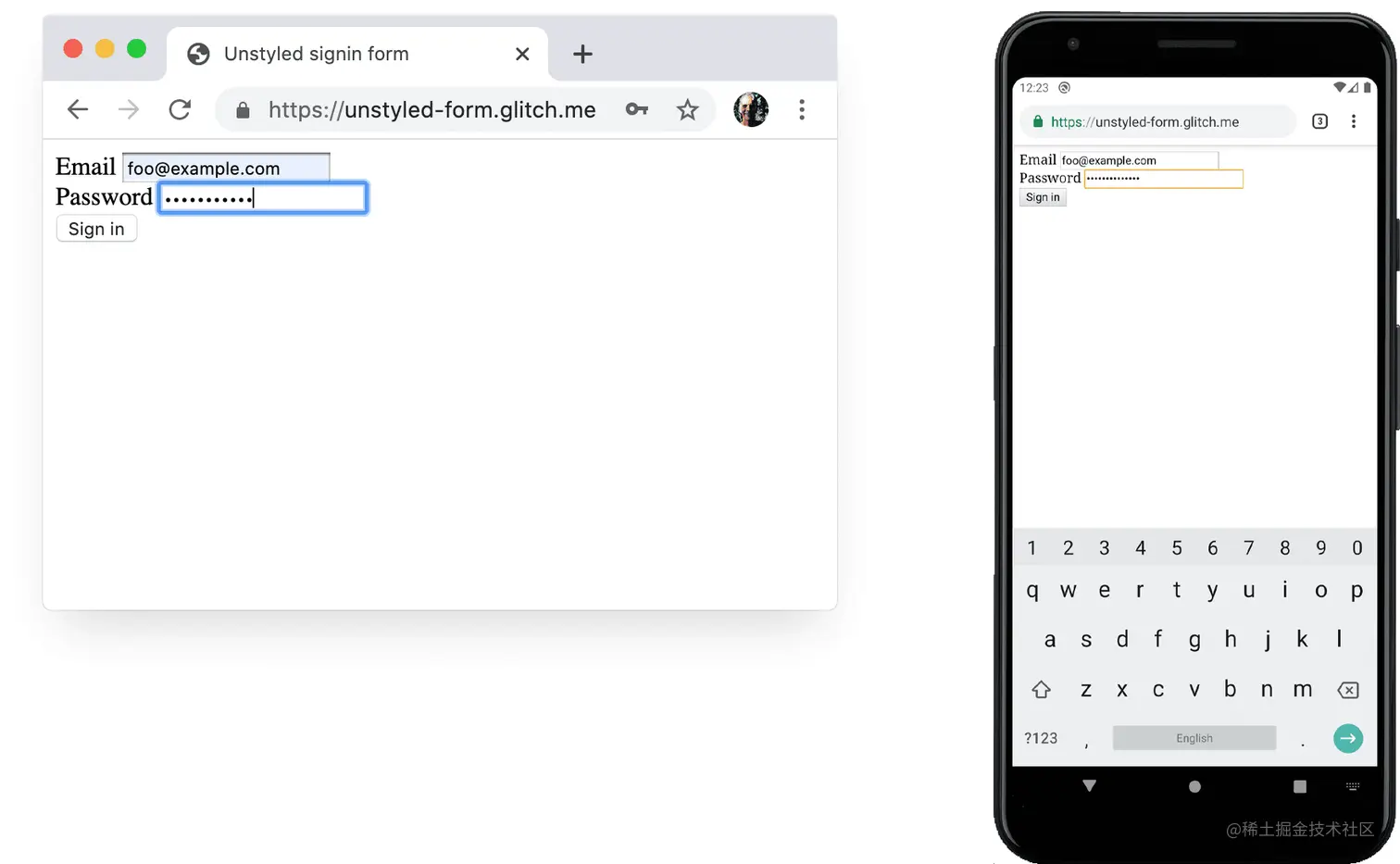 密码输入应该添加 type=“password” 来隐藏密码的文本,并且帮助浏览器理解这是个密码输入。(浏览器使用了 多种方式 来理解输入框的角色以及决定是否提供保存密码的功能)