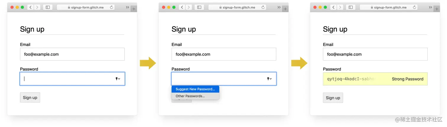 你可以帮助浏览器正确的保存数据并自动填充,然后用户就可以不用去集邮箱和密码了。 这对于移动端特别重要,尤其是在输入邮箱的时候,(重复输入邮箱)往往导致 high abandonment rates
