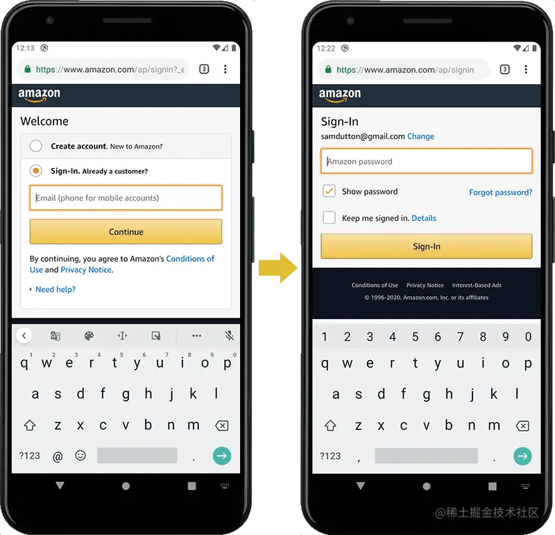 有些网站(包括 Amazon 和 eBay)通过分别为邮箱和密码使用两个页面来规避这一问题。这个方法同时也让体验更简单: 用户一次只用做一件事。