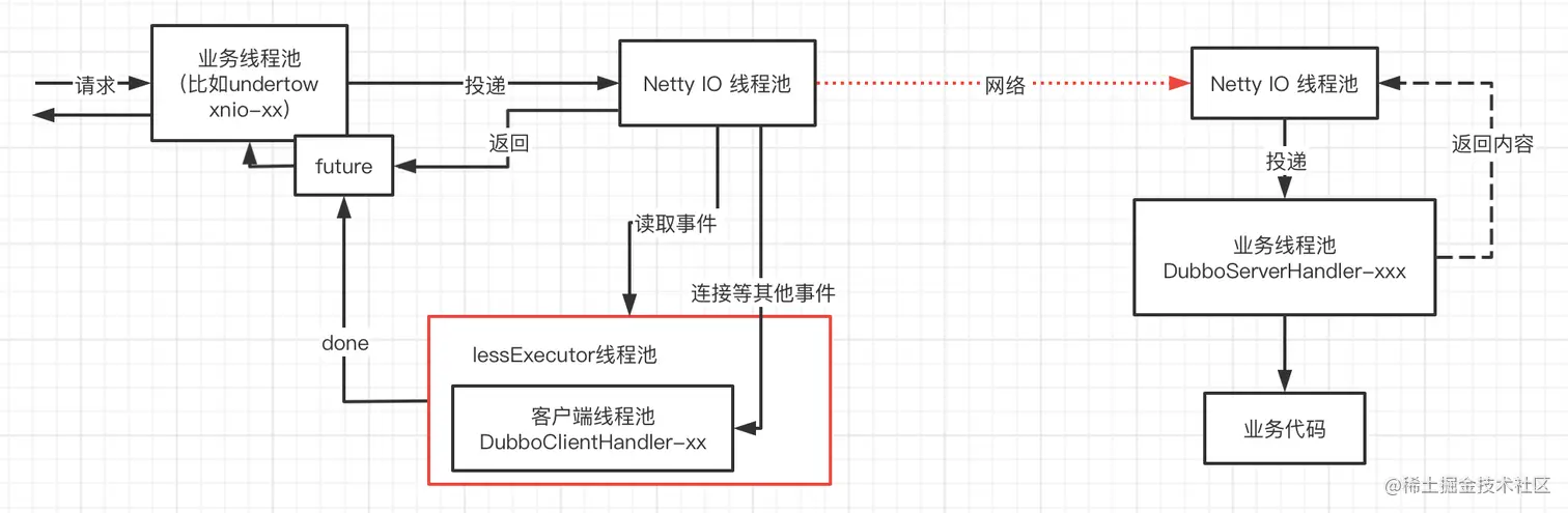 在微服务系统中,影响性能的处理硬件之外,首当其冲的应该就是通信框架了,dubbo底层默认采用netty作为通信框架,扩展了同步转异步等功能,今天我们要一起学习的是dubbo的线程池模型,分为消费端和生产端,下面是两端的线程大致模型。
