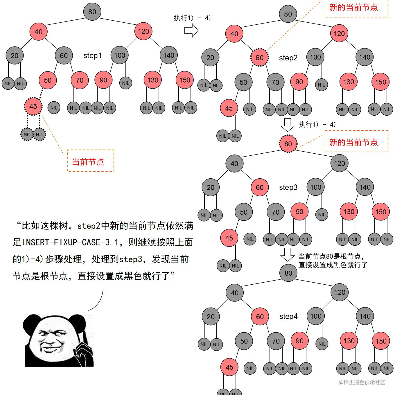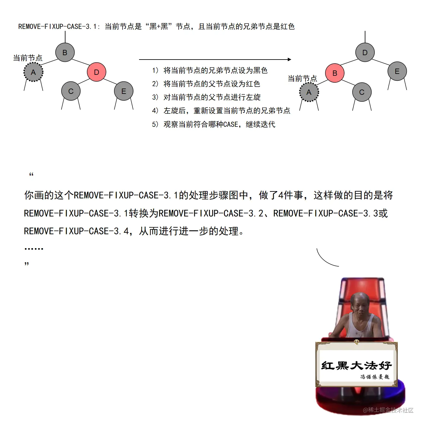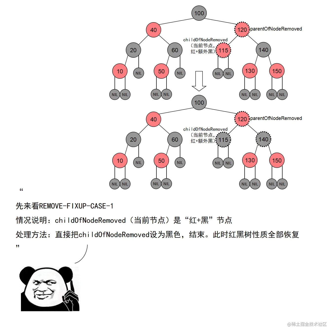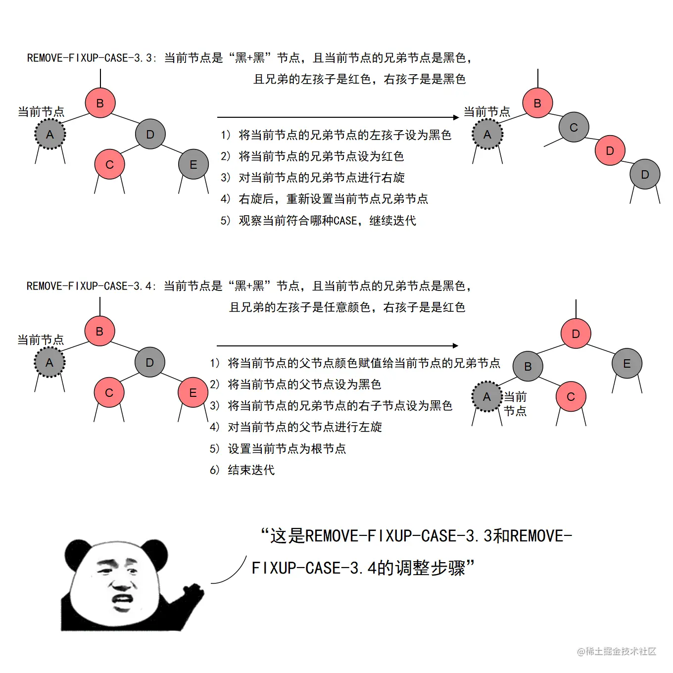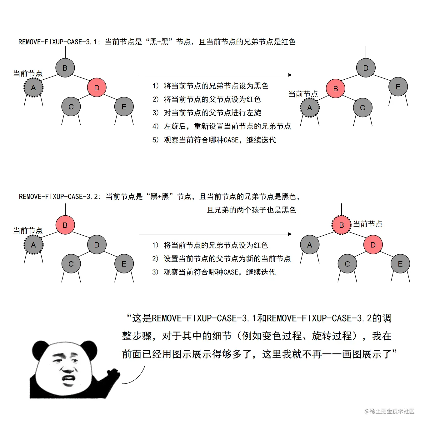 红黑树的实现中,最难的部分在于实现节点的插入和删除时,要穷举所有可能的CASE,然后对每种CASE进行处理。在理解节点的插入和删除的过程时,读者要把握住一个中心:每种CASE所进行的调整步骤都在尽量恢复插入/删除节点后所违反的红黑树特性,如果当前CASE解决不了,就转成另一种更接近问题解决状态的CASE。每种CASE的所进行的调整步骤都是为了向解决问题的出口更靠近一步,直至找到出口。