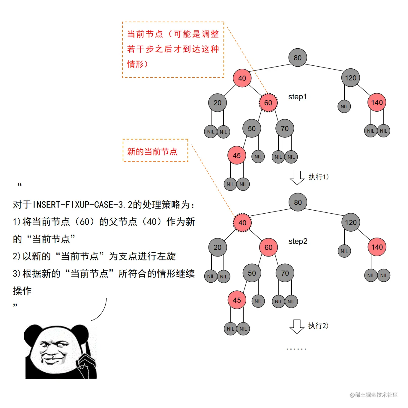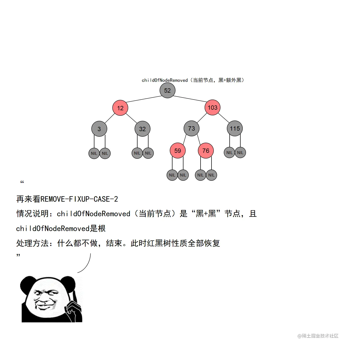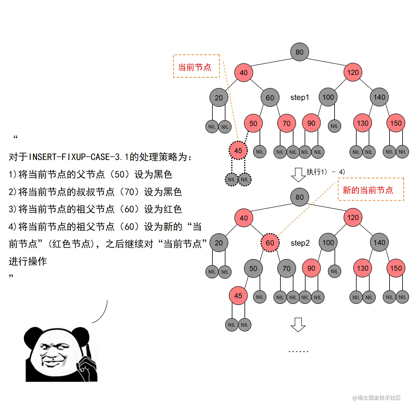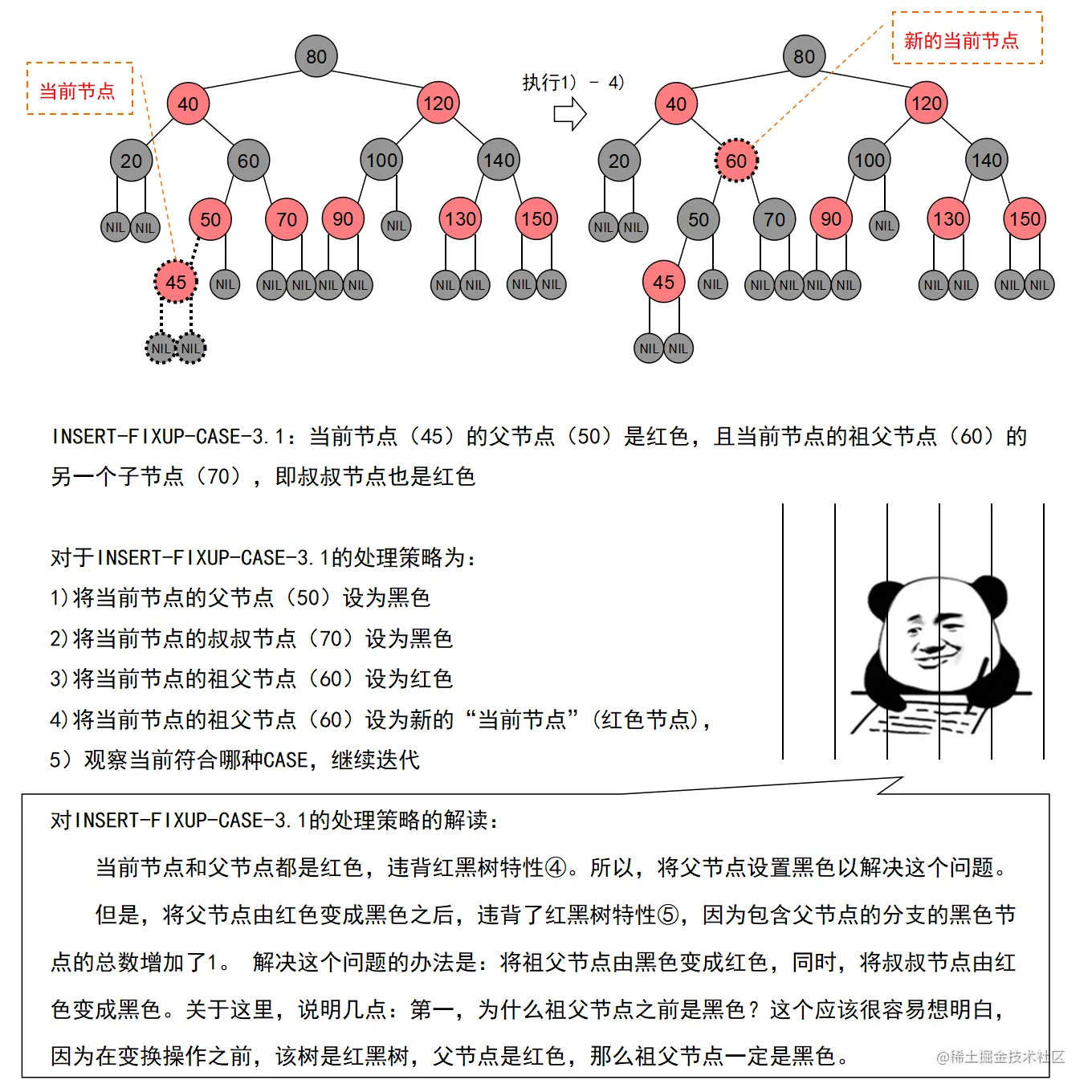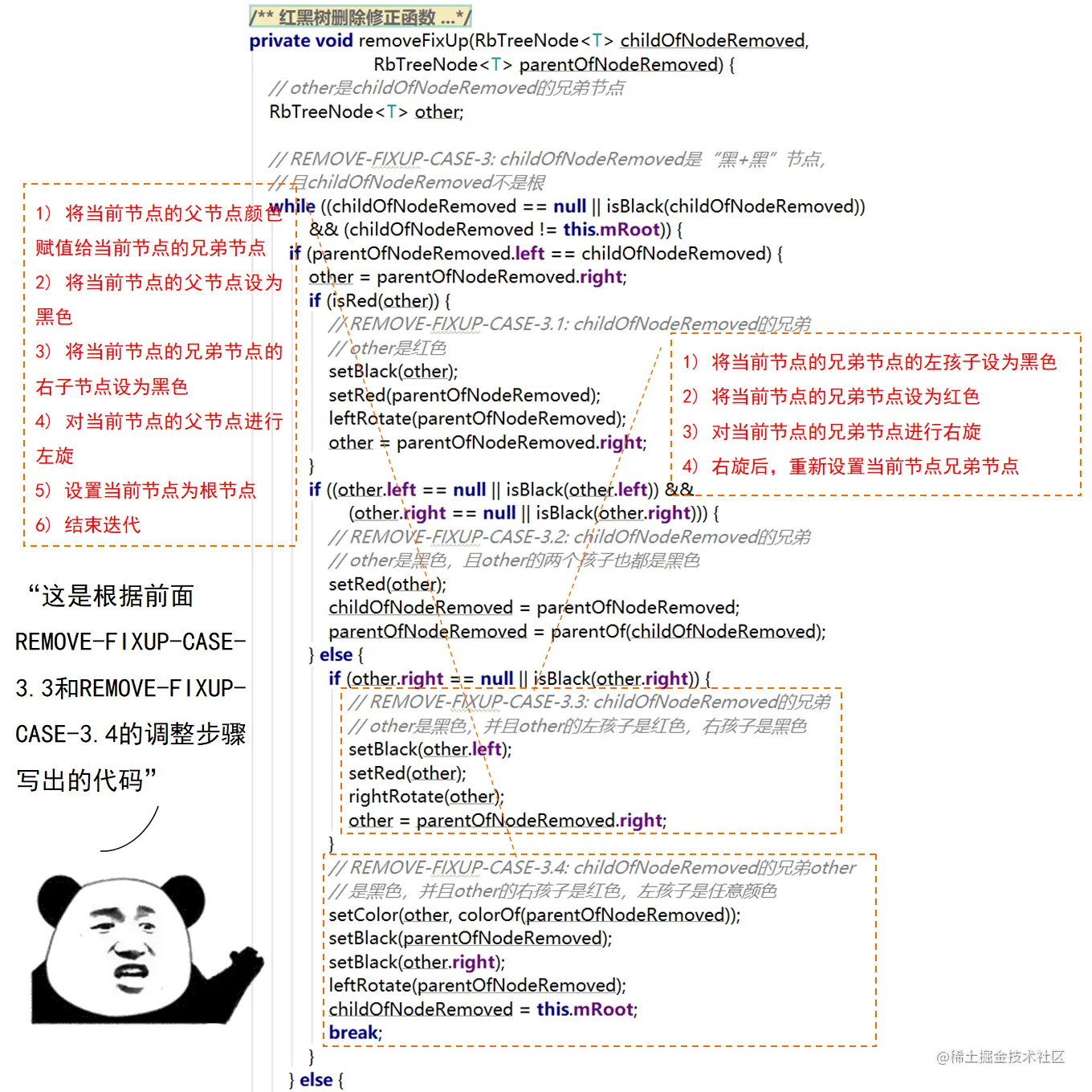 红黑树的实现中,最难的部分在于实现节点的插入和删除时,要穷举所有可能的CASE,然后对每种CASE进行处理。在理解节点的插入和删除的过程时,读者要把握住一个中心:每种CASE所进行的调整步骤都在尽量恢复插入/删除节点后所违反的红黑树特性,如果当前CASE解决不了,就转成另一种更接近问题解决状态的CASE。每种CASE的所进行的调整步骤都是为了向解决问题的出口更靠近一步,直至找到出口。