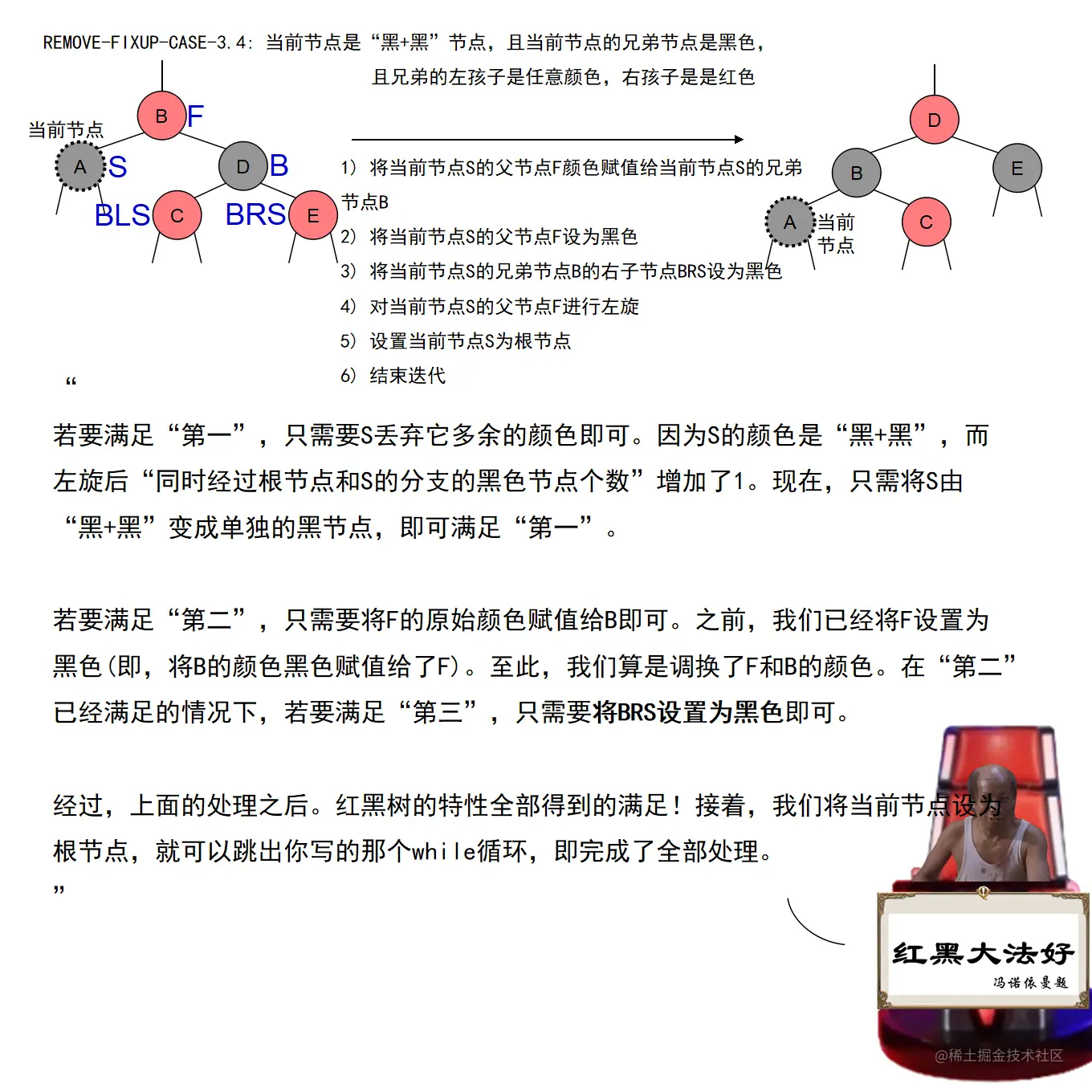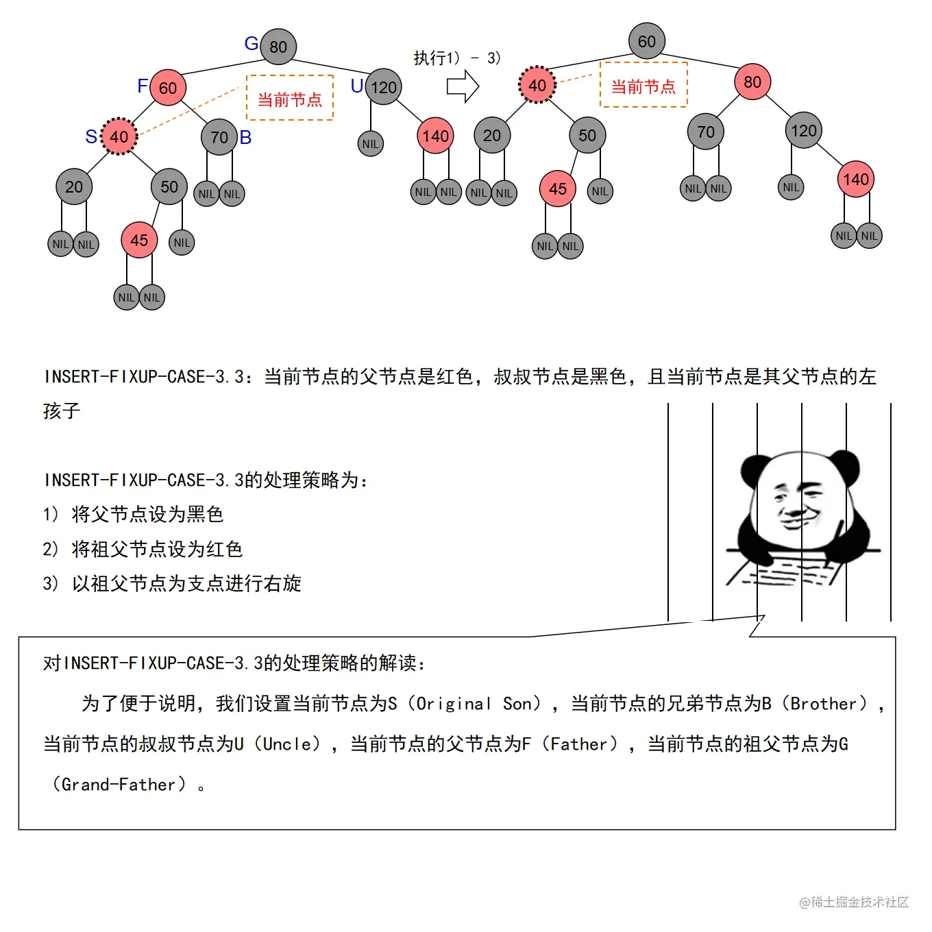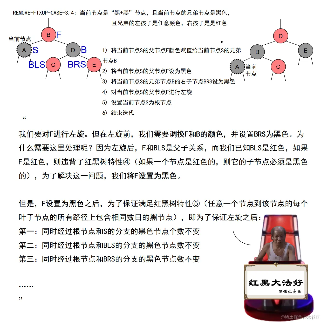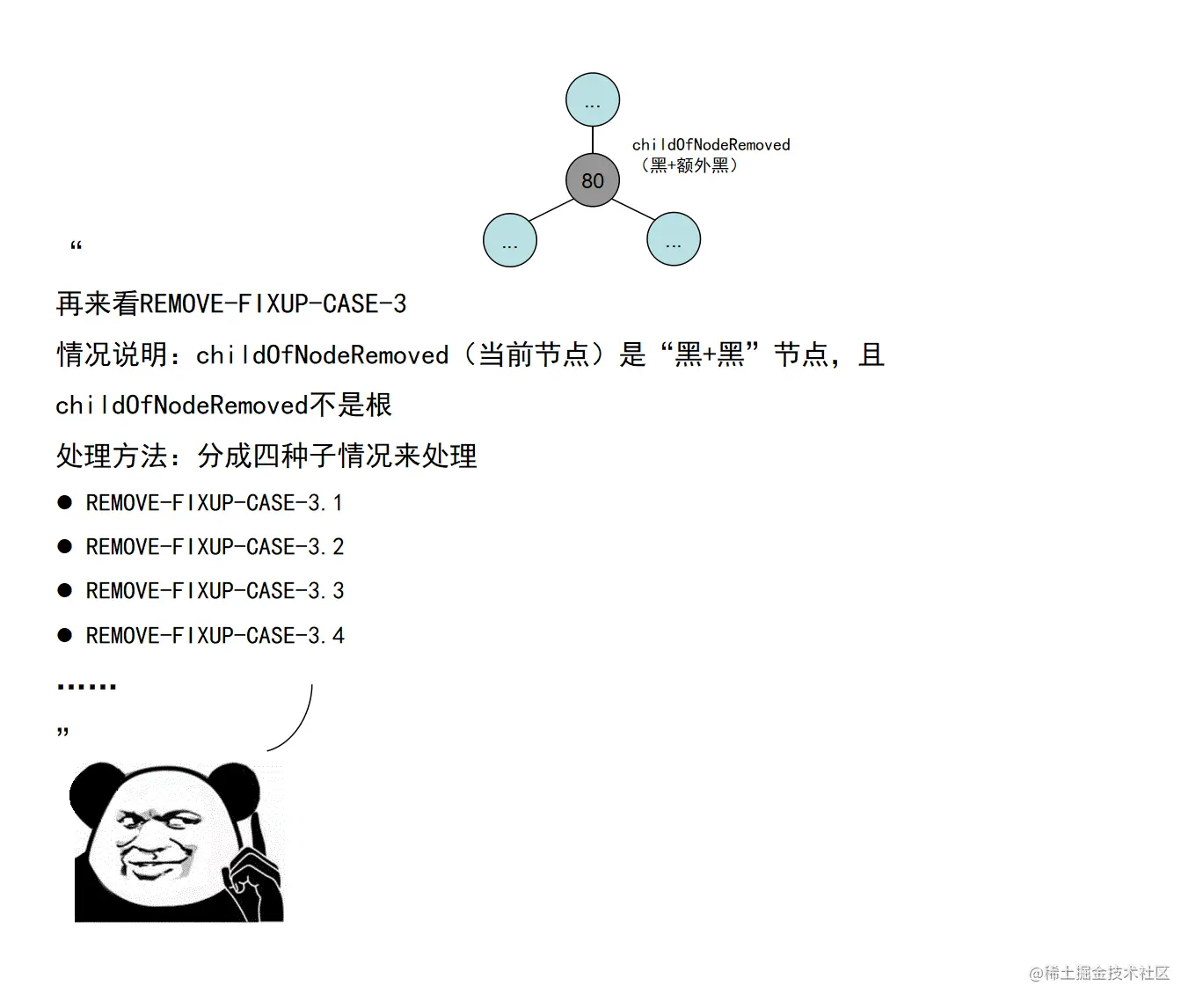 红黑树的实现中,最难的部分在于实现节点的插入和删除时,要穷举所有可能的CASE,然后对每种CASE进行处理。在理解节点的插入和删除的过程时,读者要把握住一个中心:每种CASE所进行的调整步骤都在尽量恢复插入/删除节点后所违反的红黑树特性,如果当前CASE解决不了,就转成另一种更接近问题解决状态的CASE。每种CASE的所进行的调整步骤都是为了向解决问题的出口更靠近一步,直至找到出口。