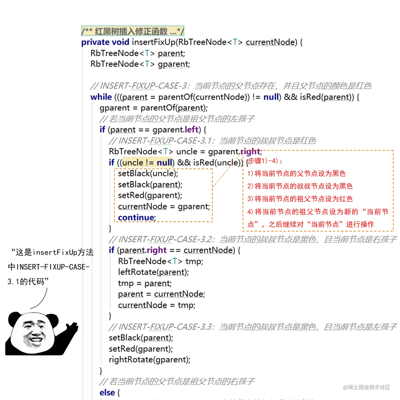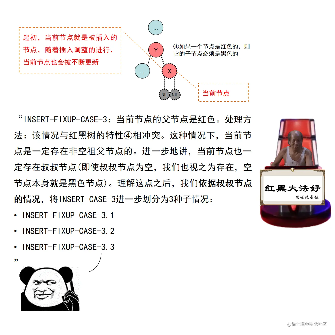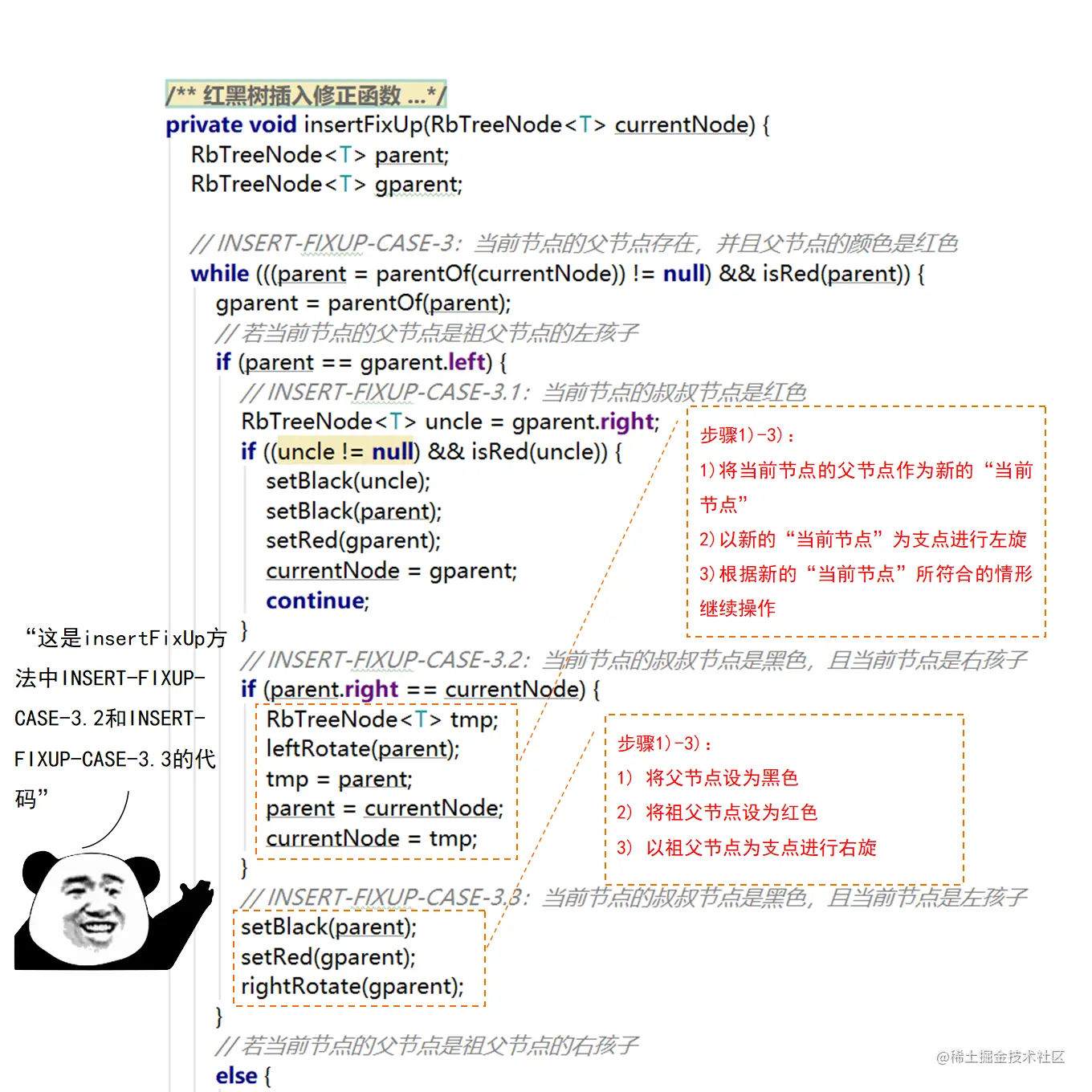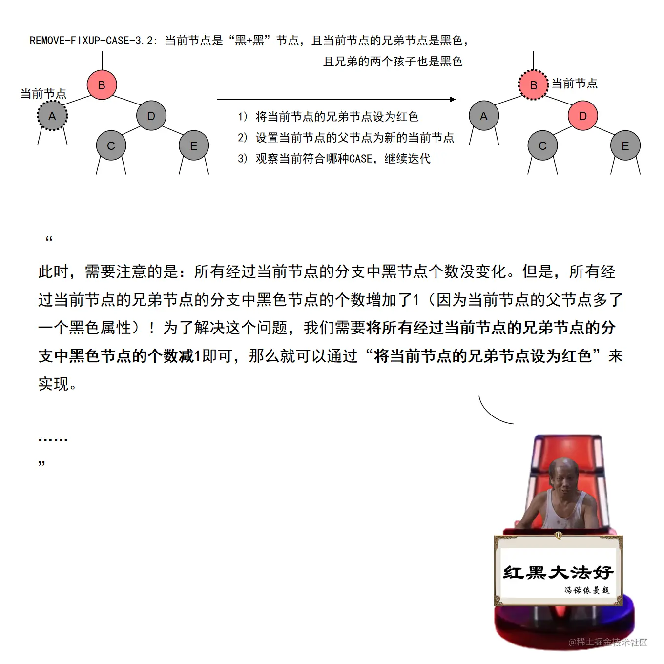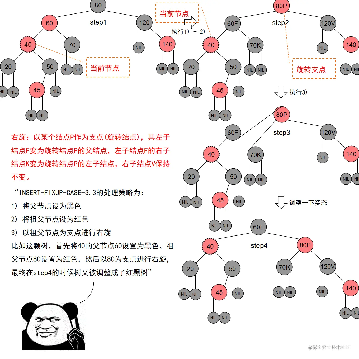 红黑树的实现中,最难的部分在于实现节点的插入和删除时,要穷举所有可能的CASE,然后对每种CASE进行处理。在理解节点的插入和删除的过程时,读者要把握住一个中心:每种CASE所进行的调整步骤都在尽量恢复插入/删除节点后所违反的红黑树特性,如果当前CASE解决不了,就转成另一种更接近问题解决状态的CASE。每种CASE的所进行的调整步骤都是为了向解决问题的出口更靠近一步,直至找到出口。