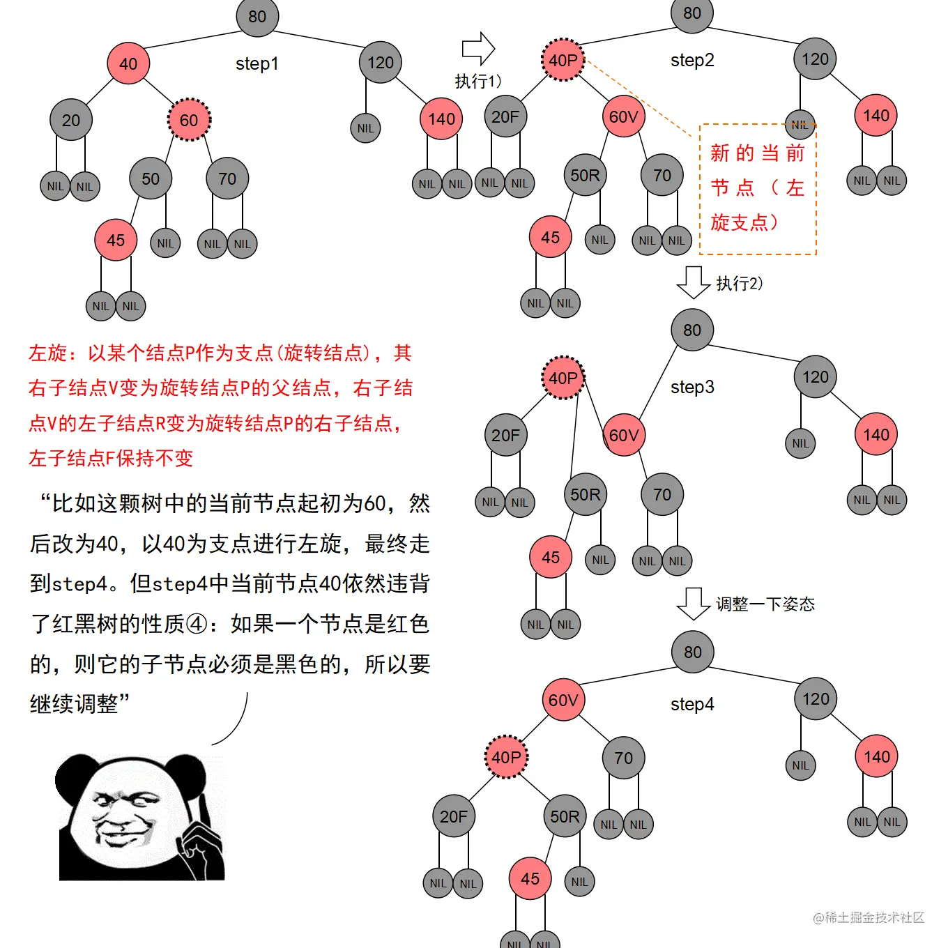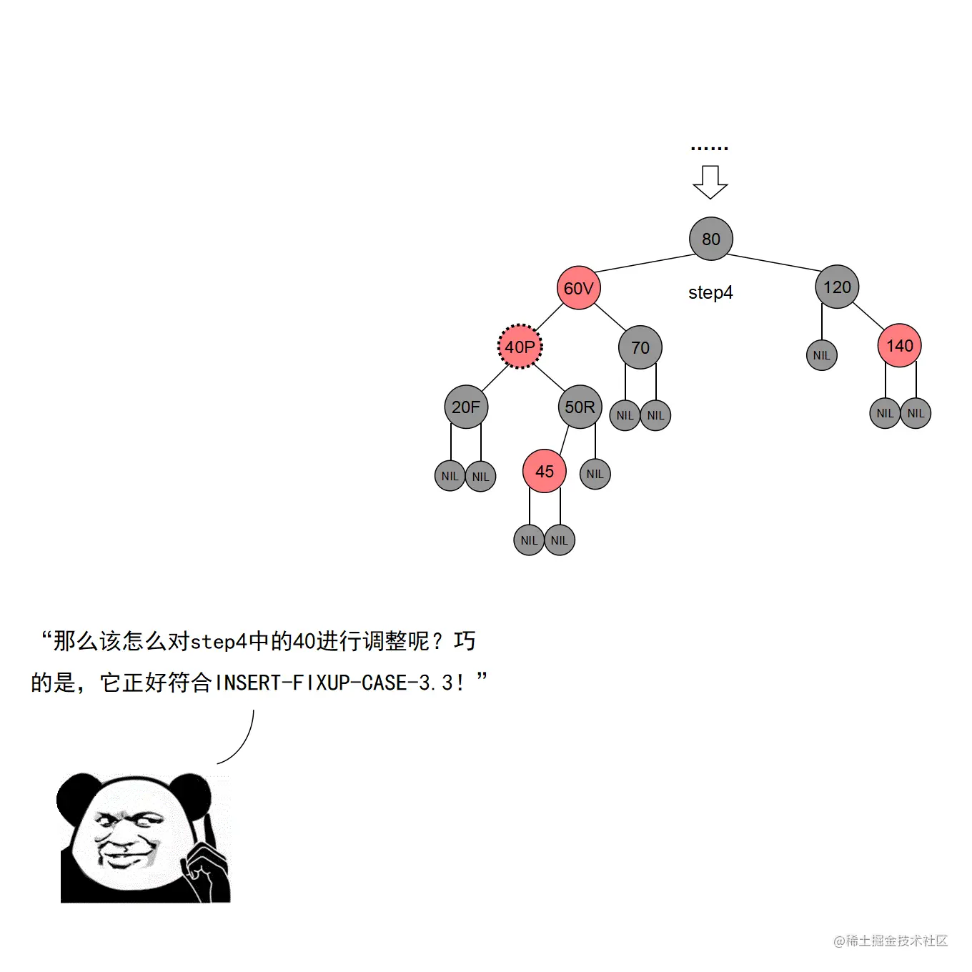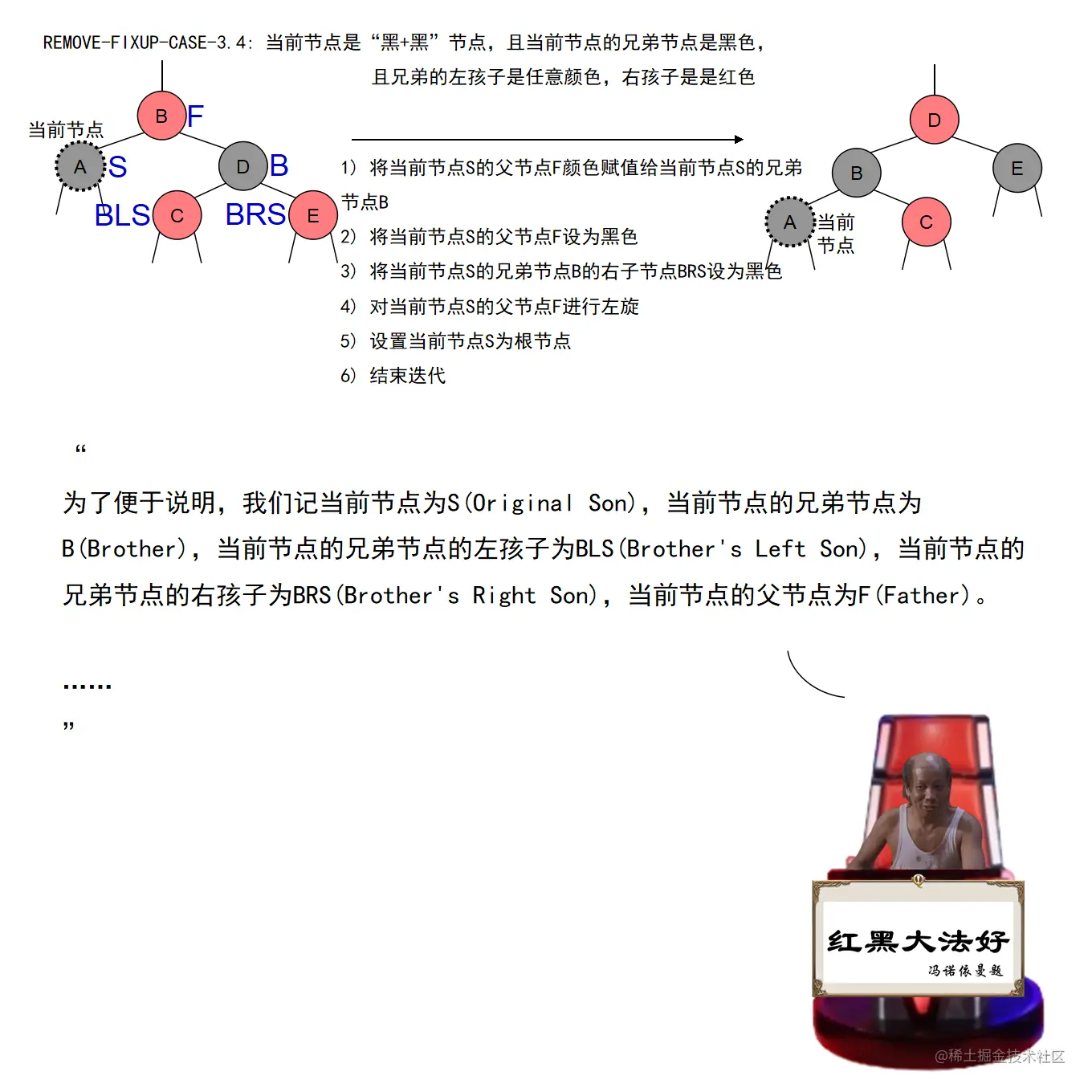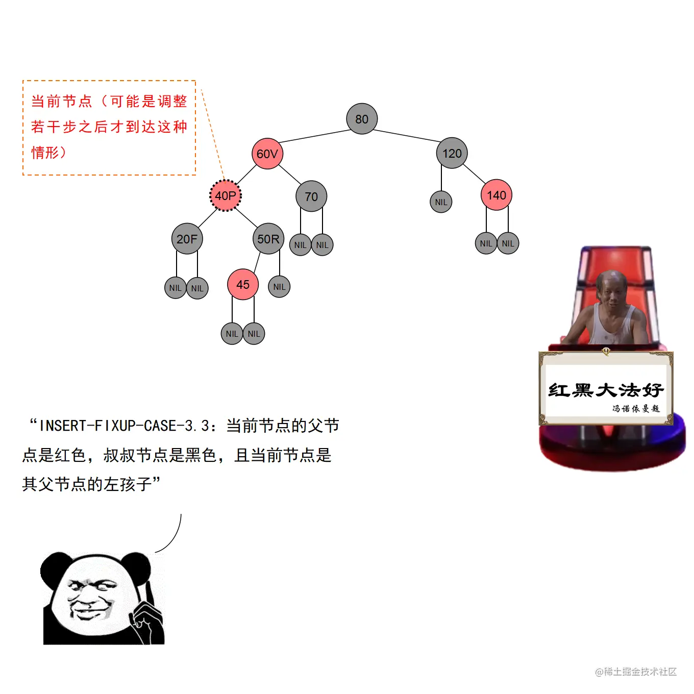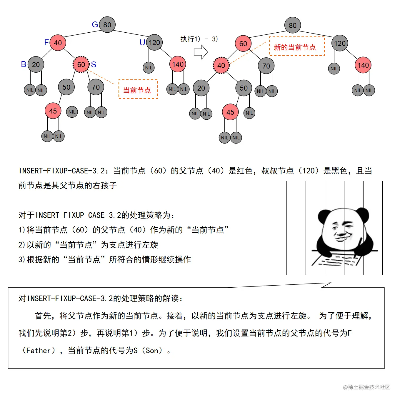 红黑树的实现中,最难的部分在于实现节点的插入和删除时,要穷举所有可能的CASE,然后对每种CASE进行处理。在理解节点的插入和删除的过程时,读者要把握住一个中心:每种CASE所进行的调整步骤都在尽量恢复插入/删除节点后所违反的红黑树特性,如果当前CASE解决不了,就转成另一种更接近问题解决状态的CASE。每种CASE的所进行的调整步骤都是为了向解决问题的出口更靠近一步,直至找到出口。