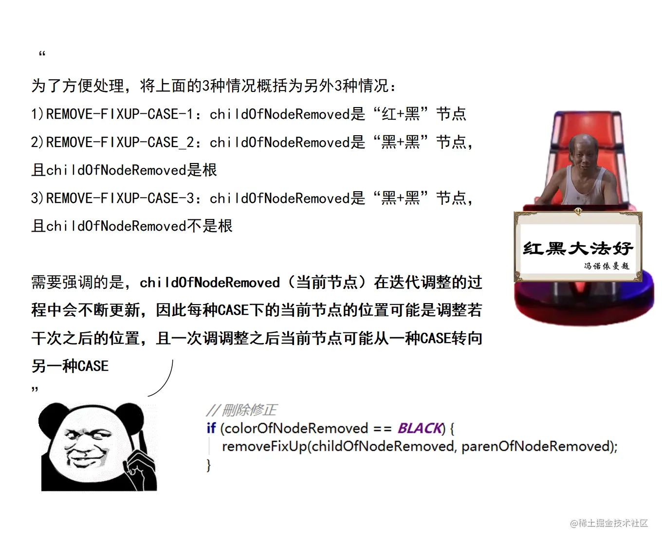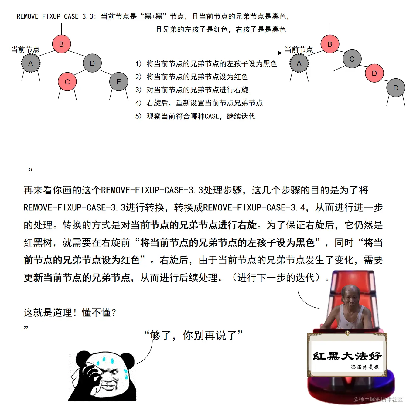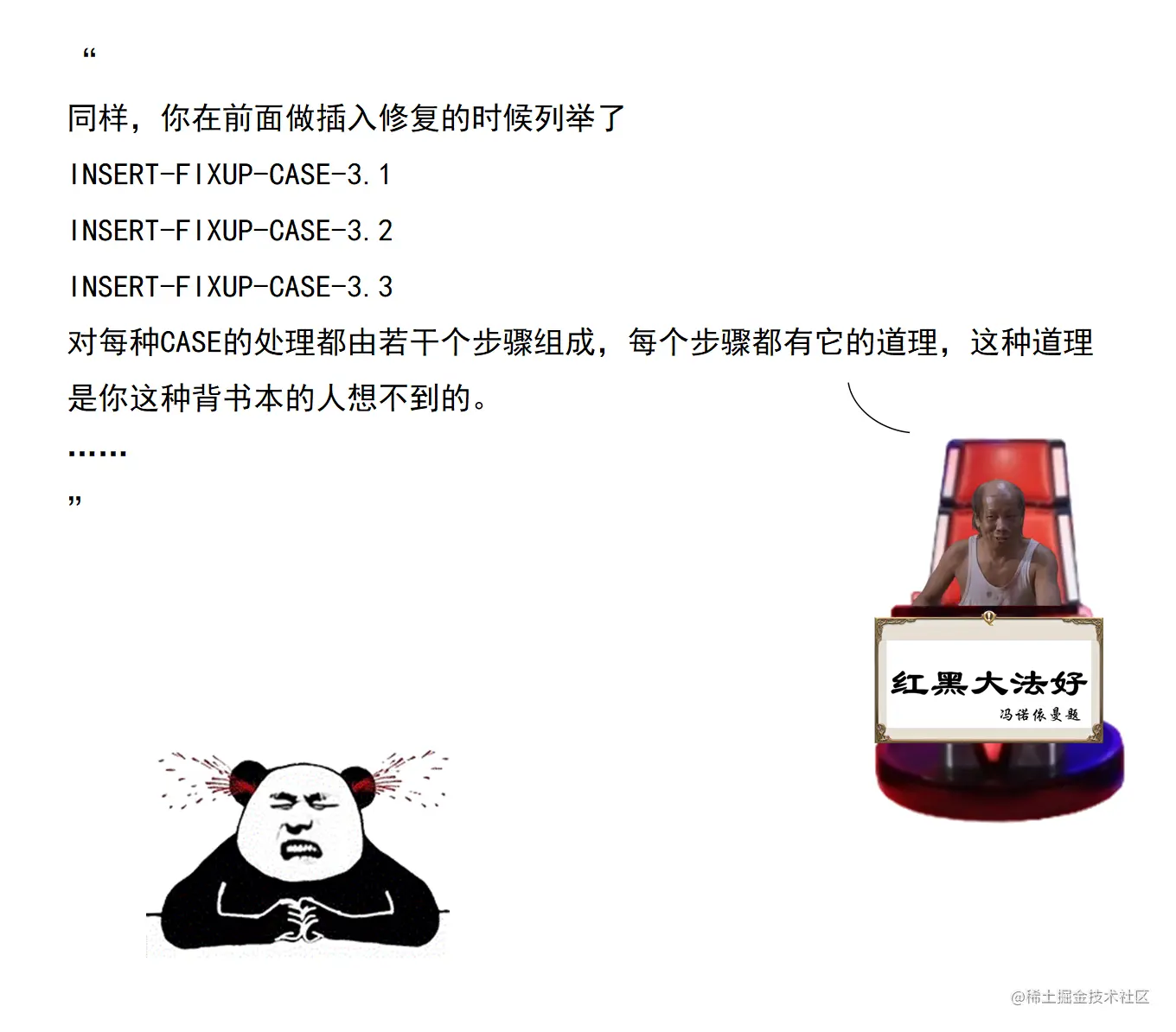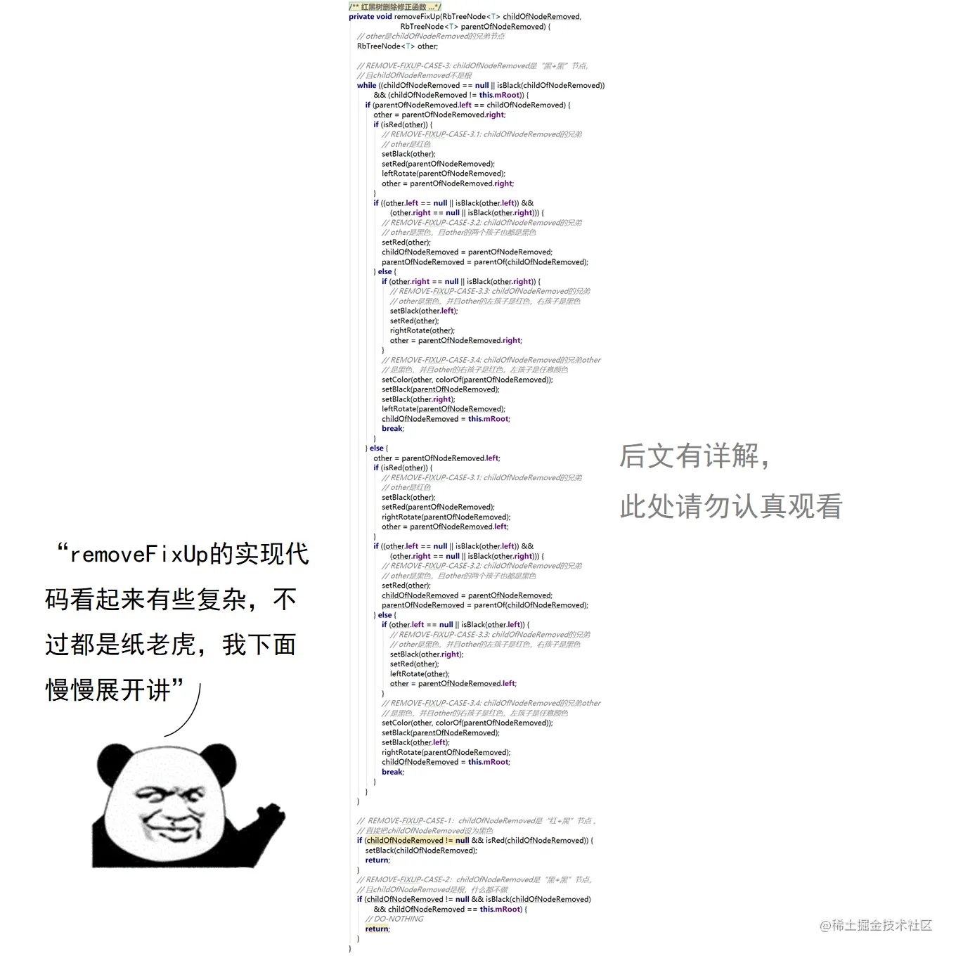 漫画采用大量的图示来展示红黑树操作的诸多细节,作者力求详尽,因此篇幅略长。附录给出了完整的二叉查找树定义 + 测试代码,以及红黑树定义 + 测试代码。两份代码均经过了若干次十万数量级随机节点插入和删除测试,结果均无误。读者可贴到自己的 IDE 中,结合本文讲解进行调试研究。
