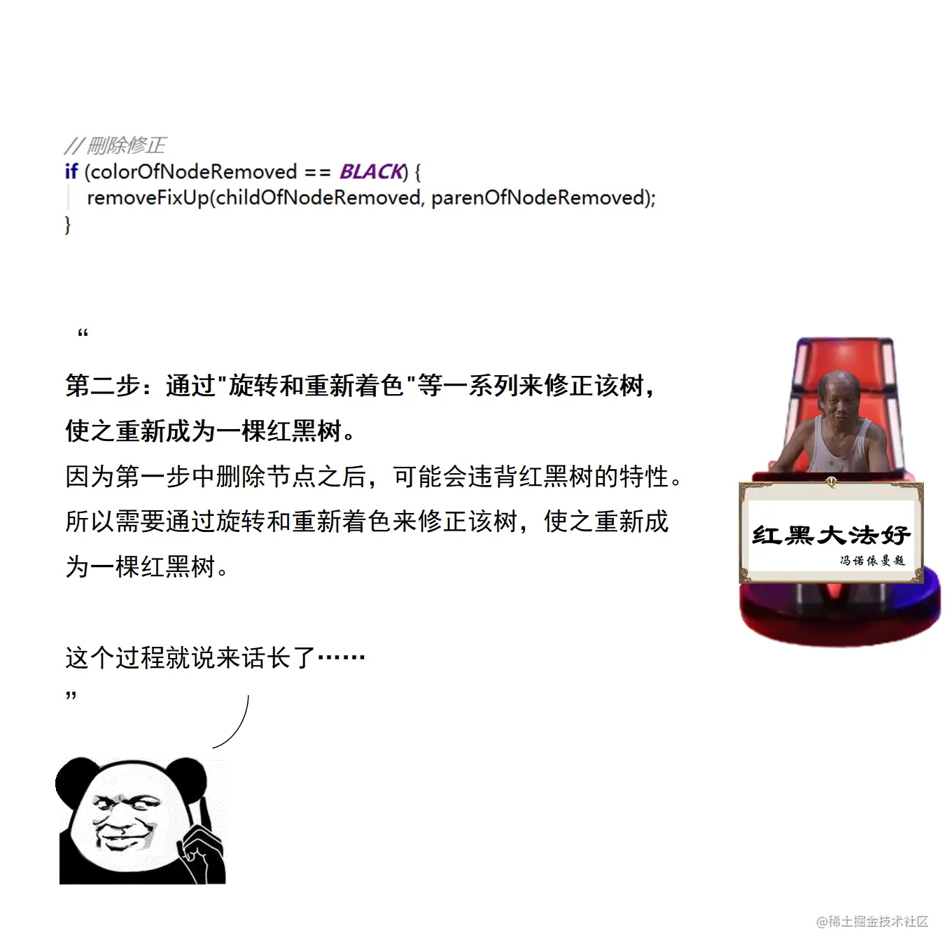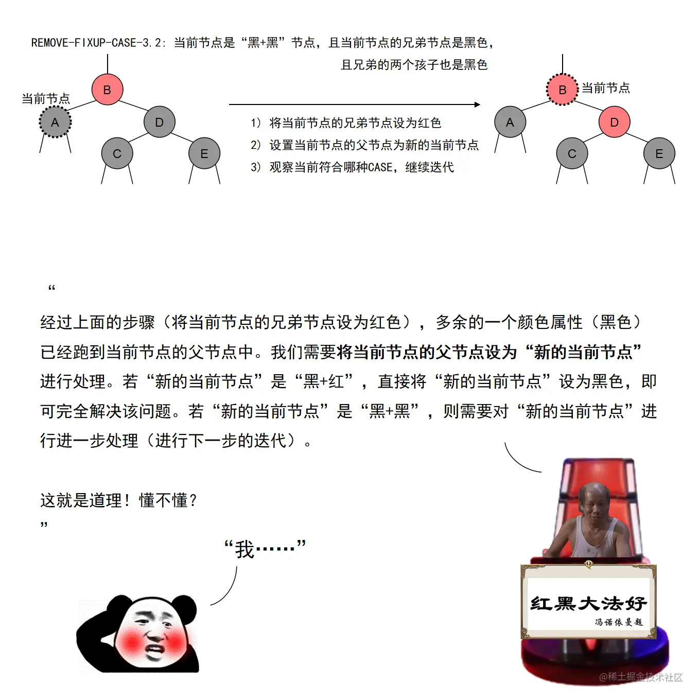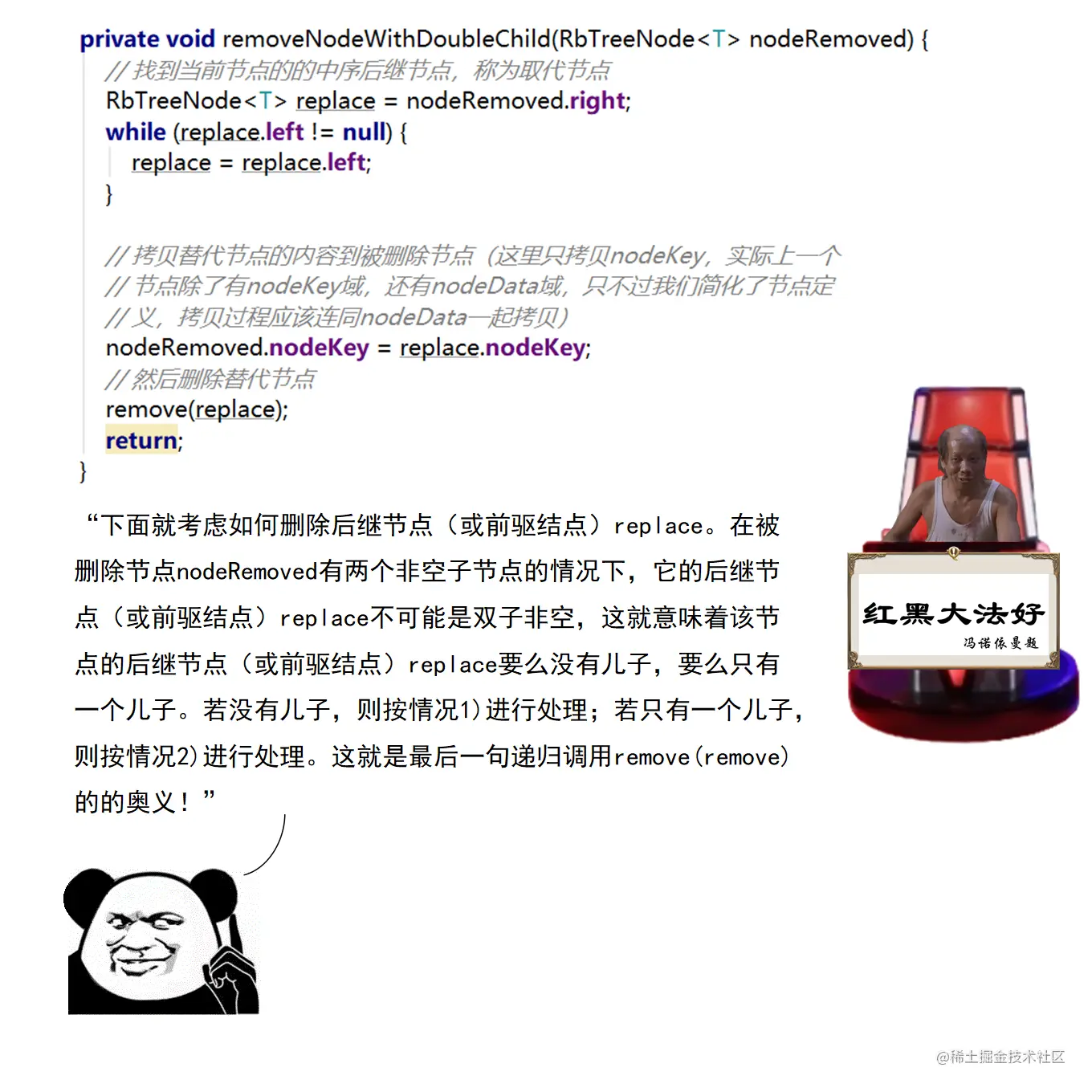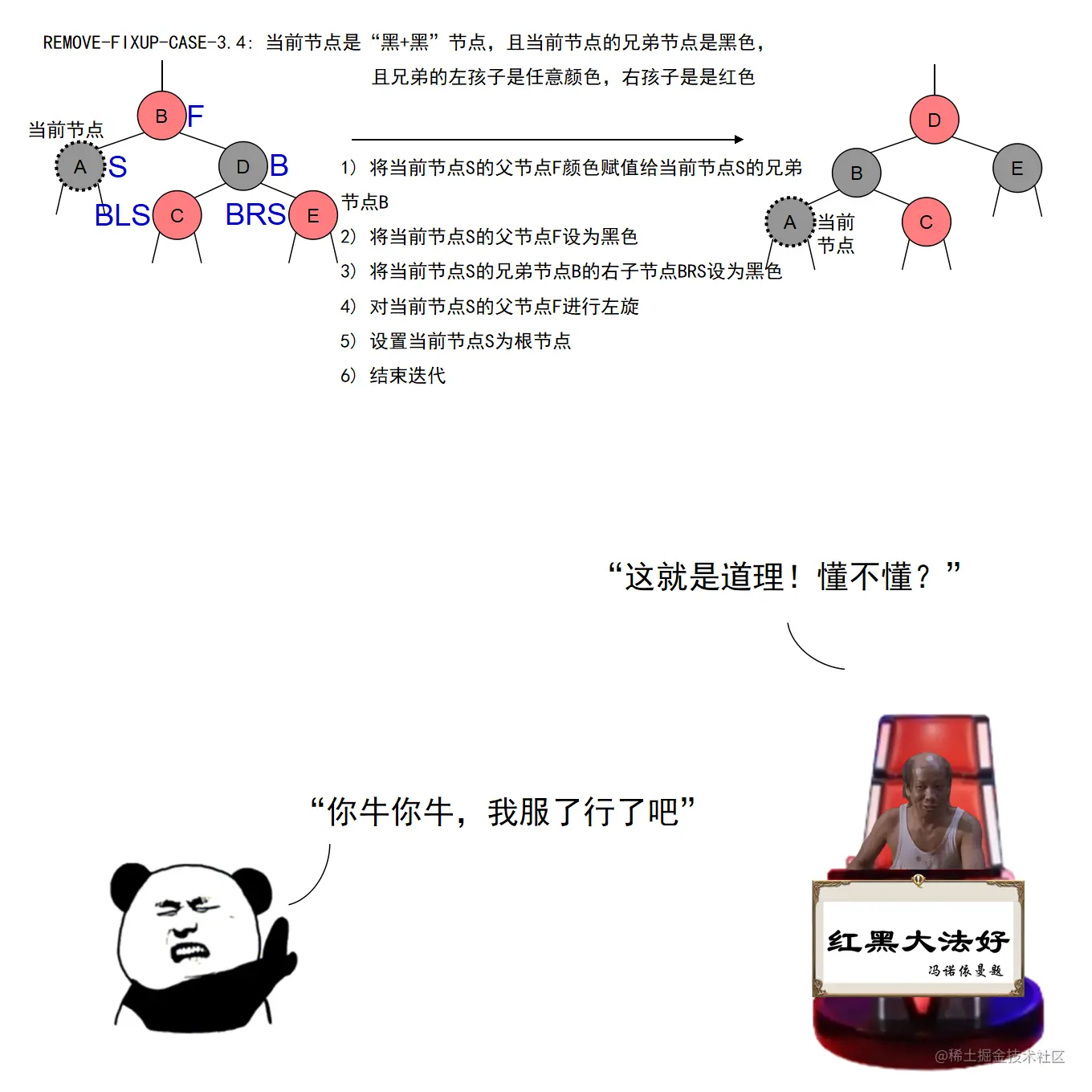 漫画采用大量的图示来展示红黑树操作的诸多细节,作者力求详尽,因此篇幅略长。附录给出了完整的二叉查找树定义 + 测试代码,以及红黑树定义 + 测试代码。两份代码均经过了若干次十万数量级随机节点插入和删除测试,结果均无误。读者可贴到自己的 IDE 中,结合本文讲解进行调试研究。